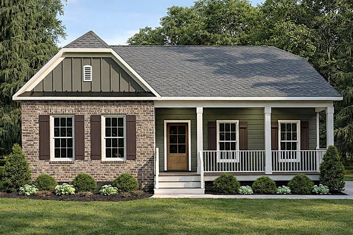 This cottage-style home features a low, inviting profile with a covered front porch and a balanced mix of brick and siding across the façade. The exterior feels classic and approachable, with simple detailing that keeps the look clean and functional.