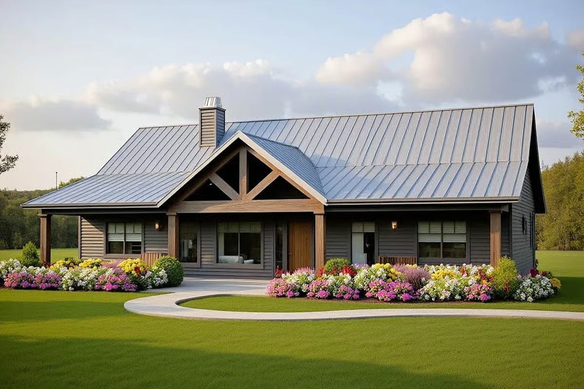This country craftsman home features a low-profile exterior with a broad metal roof, exposed gable detailing, and deep covered porches that frame the front and rear of the house. Clean lines, simple siding, and warm structural accents give the design a grounded, practical character while maintaining a strong visual presence. The wide front porch establishes a clear entry point, while the rear covered porch mirrors the layout and extends daily living to the back of the home.