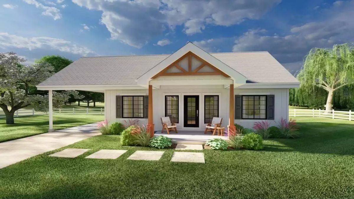 Exterior rendering shows a craftsman farmhouse with covered porch and carport, paired with a floor plan featuring two bedrooms, mudroom, and open kitchen-living layout.