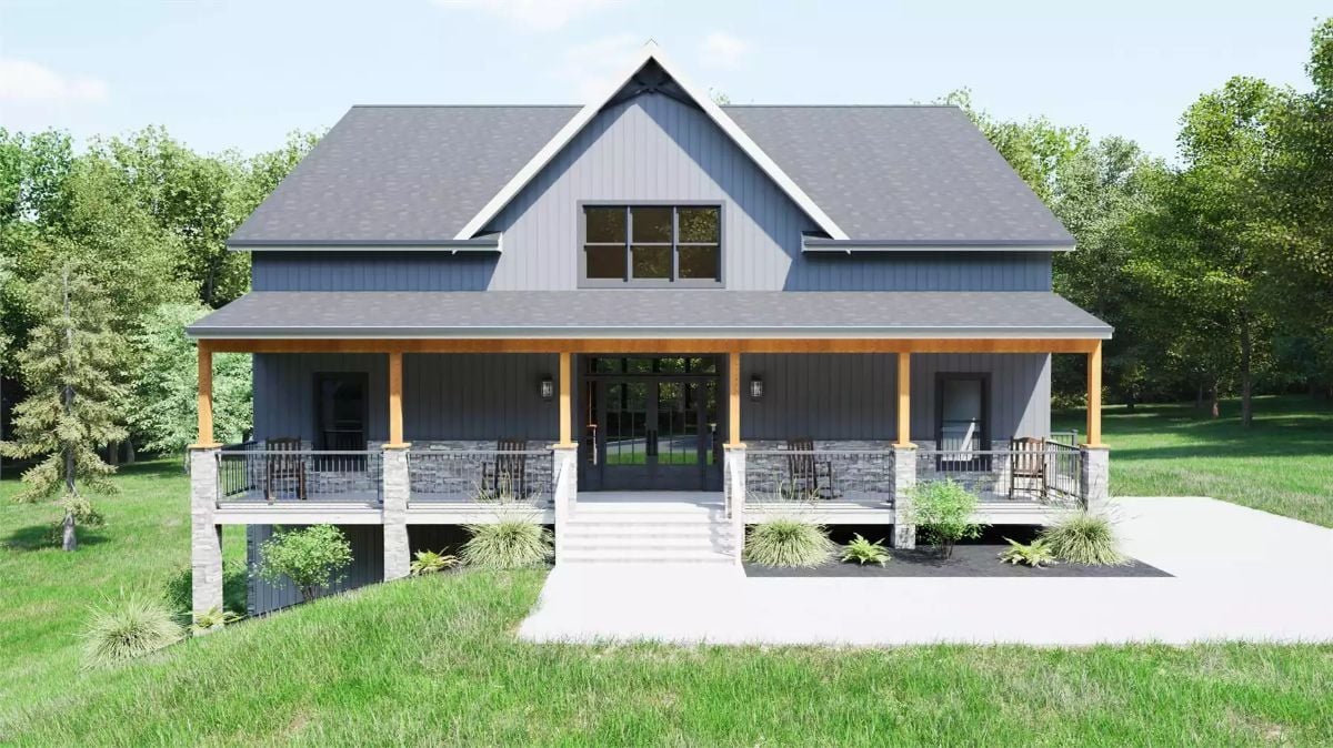 This country home features board-and-batten siding in contrasting tones with a prominent front gable and wraparound covered deck. Natural wood columns and stone accents create a welcoming farmhouse aesthetic with abundant outdoor living space.
