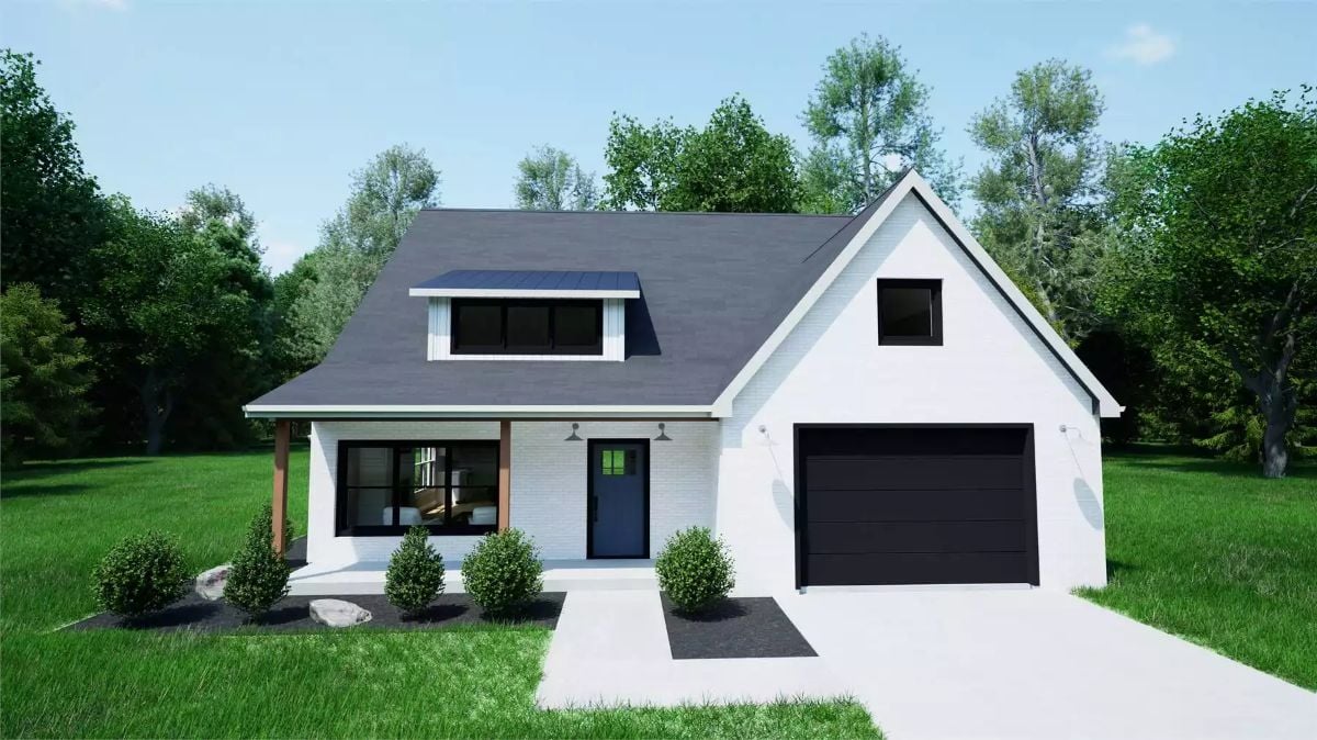 This country-style home presents a clean, straightforward exterior with a steep roofline, simple detailing, and a covered front porch that gives it a welcoming presence. The attached garage is integrated into the overall form, maintaining a balanced and functional street-facing design.