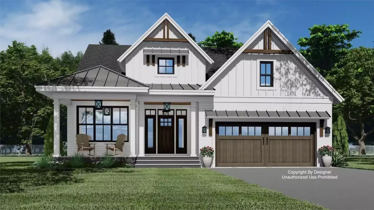This country-style home presents a clean, balanced exterior with crisp white siding, steep gables, and dark window accents that add contrast and definition. A covered front porch and simple rooflines give the home a welcoming, timeless presence.