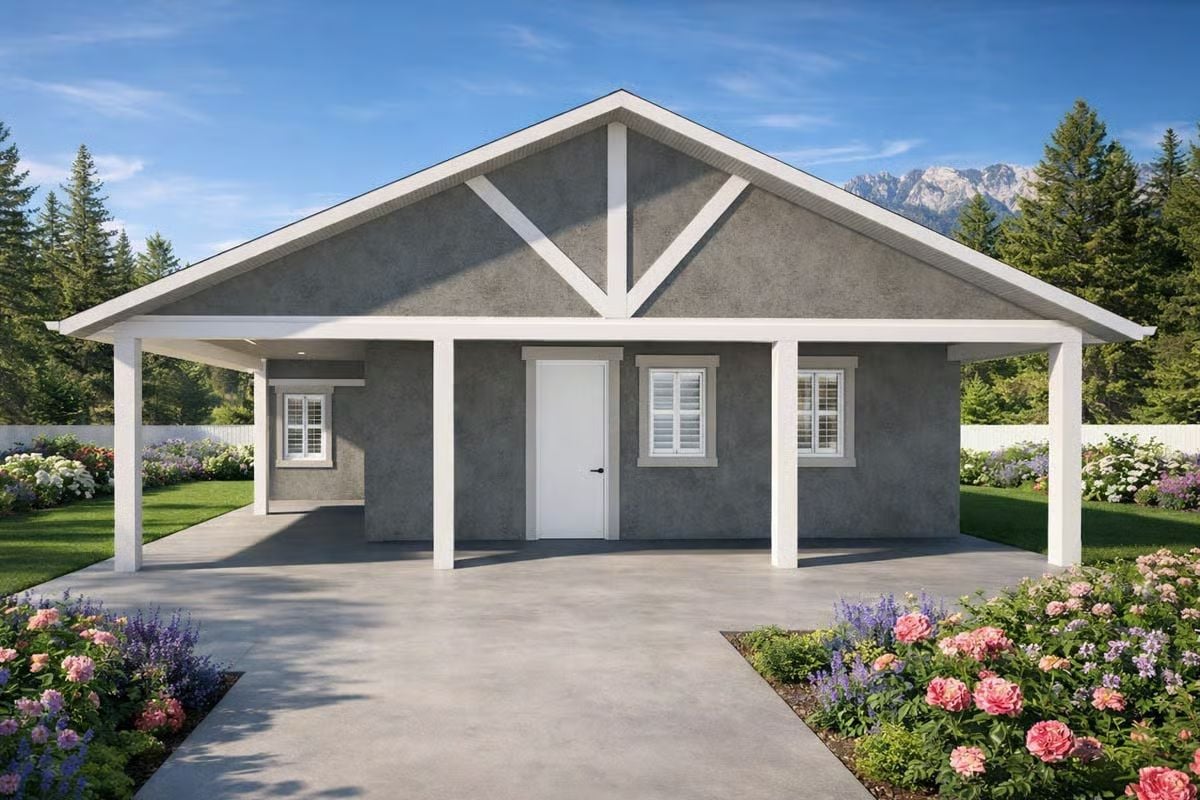 Worth Knowing: Covered patios attached to the rear of a home can add usable outdoor square footage without requiring a full addition permit in many municipalities. The white structural columns seen here do double duty, supporting the roof load while defining the patio boundary visually. Pairing them with matching gable trim ties the addition to the main roofline for a cohesive look.