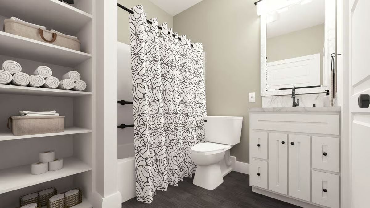 Two bedrooms are positioned for privacy on opposite sides of the home, each with direct access to a full bathroom and a walk-in closet. A laundry nook and pantry add everyday convenience, while optional rear patios extend the living area outdoors.