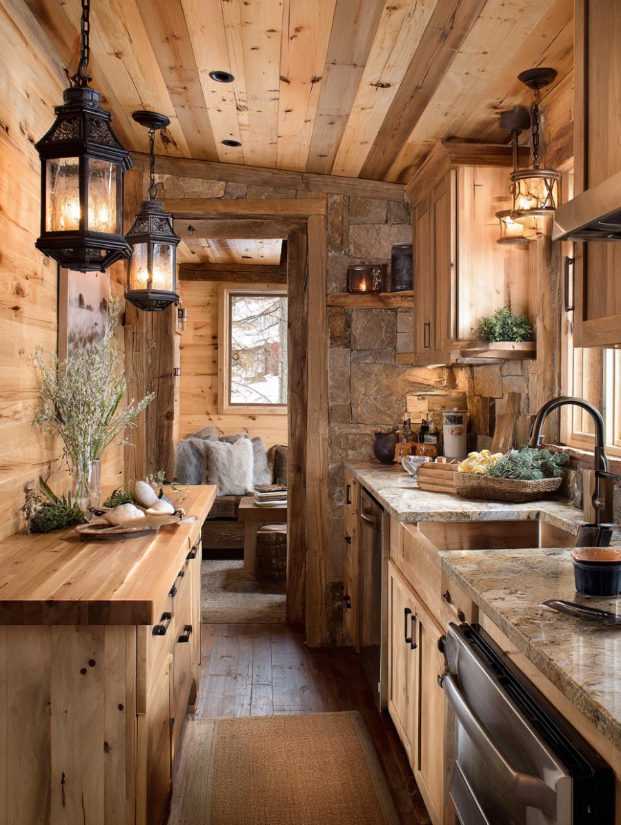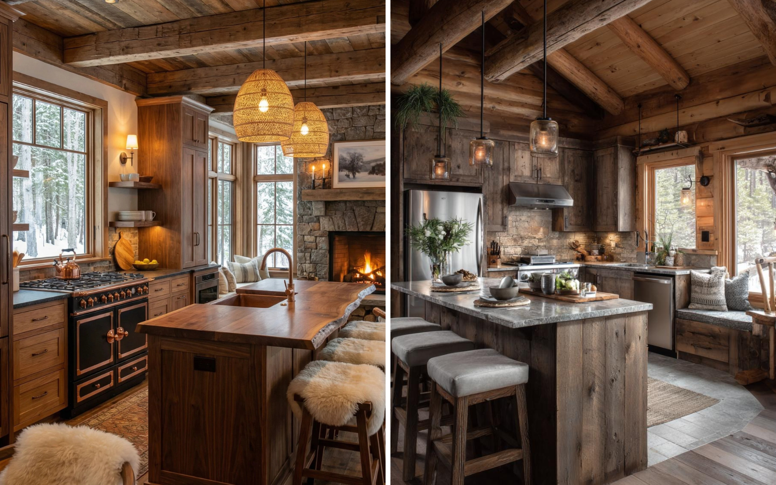 Exposed Beam Charm Meets Stone Fireplace Warmth in Compact Log Home Kitchen