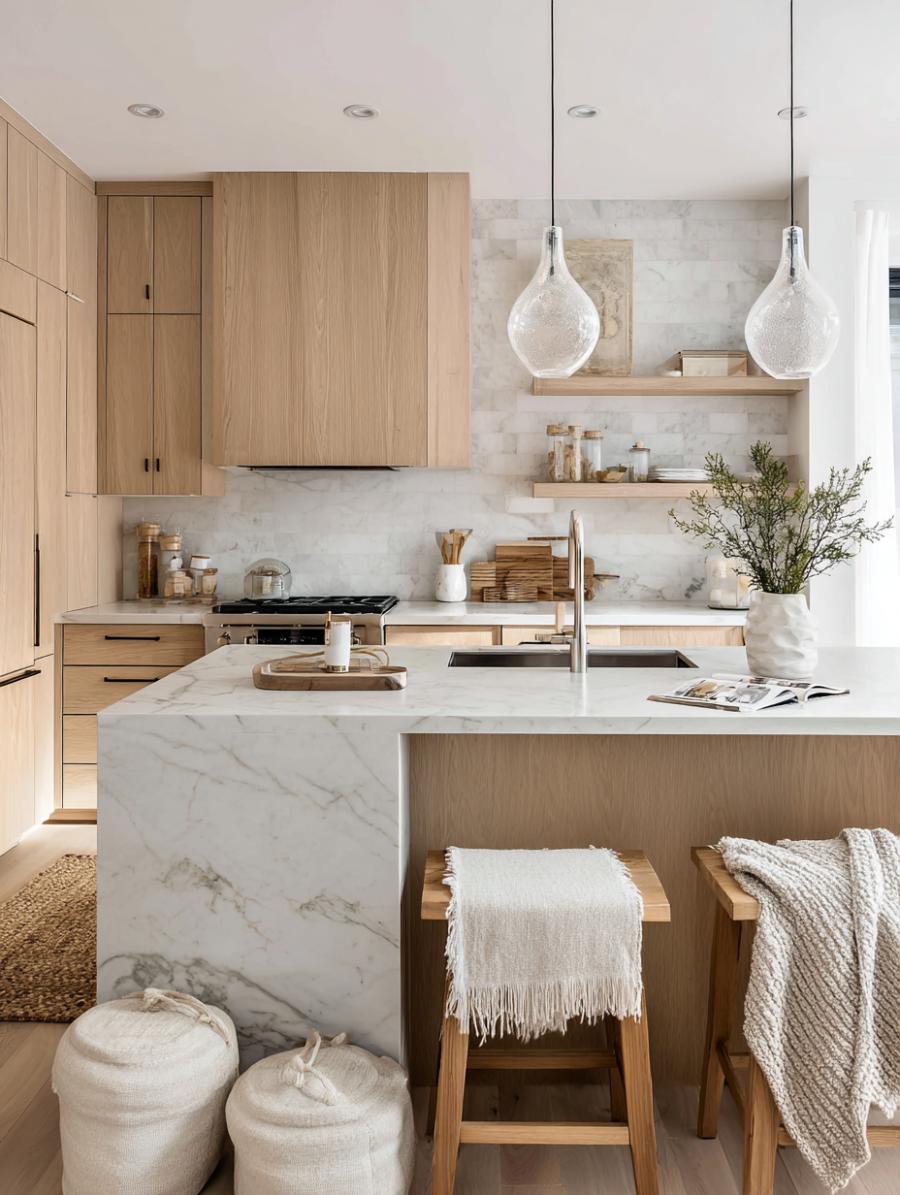 Natural oak cabinetry creates seamless storage while white marble countertops and backsplash add luxurious contrast to this cozy kitchen. Floating wooden shelves display everyday essentials, transforming functional items into decorative elements. Glass globe pendants cast gentle light over the waterfall island, where woven bar stools invite lingering conversations. Neutral textiles and organic accessories complete the hygge atmosphere.