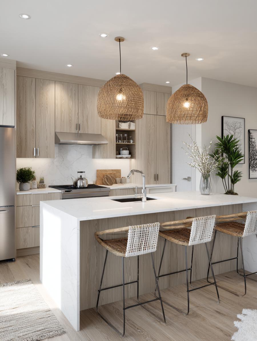Natural wicker pendant lights create stunning focal points above this sleek kitchen island, perfectly balancing rustic texture with contemporary clean lines. Light wood grain cabinetry in warm taupe tones pairs beautifully with crisp white quartz countertops, while woven counter stools echo the organic materials overhead. Recessed lighting ensures functionality while the natural fiber pendants add cozy hygge ambiance to daily cooking routines.