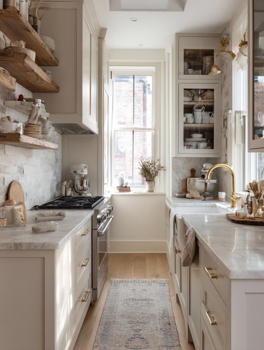 Reclaimed wood floating shelves create stunning contrast against crisp white cabinetry and luxurious marble countertops. Brass hardware and fixtures add warmth throughout this narrow galley layout, while glass-front upper cabinets display curated dishware collections. Natural light floods through traditional sash windows, illuminating the subway tile backsplash and creating an inviting workspace that maximizes every inch of available space.