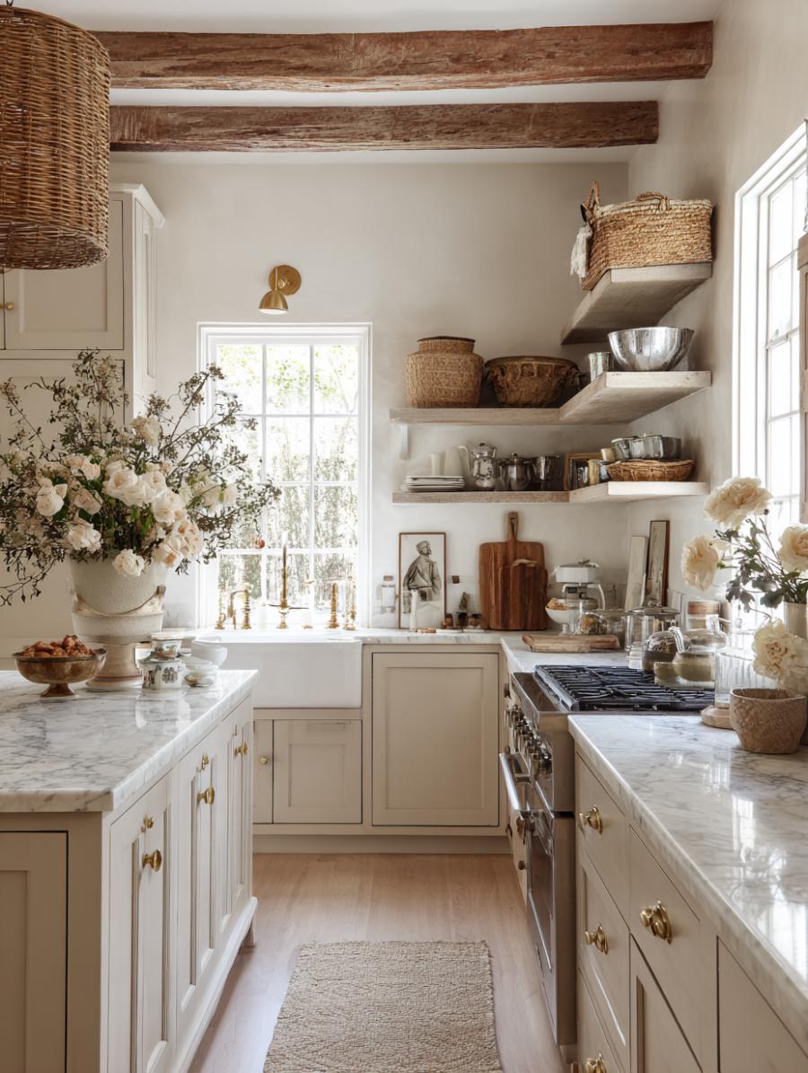 Natural wicker pendant lighting casts gentle shadows across marble countertops while exposed oak ceiling beams anchor the space with rustic charm. Cream-painted Shaker cabinets paired with brass hardware create timeless appeal, while floating shelves display handwoven baskets and ceramic bowls. Fresh white peonies in ceramic vessels soften the neutral palette, and a jute runner adds textural warmth underfoot.