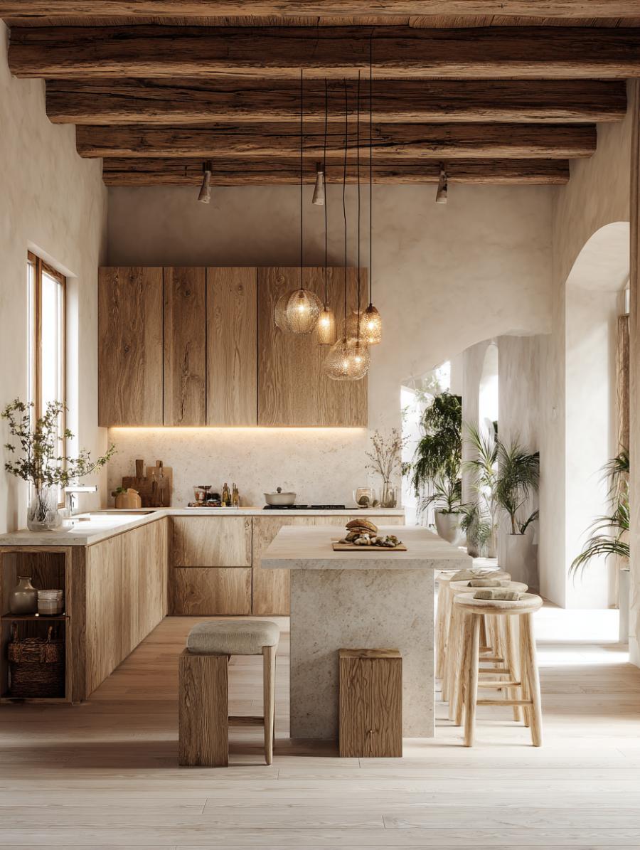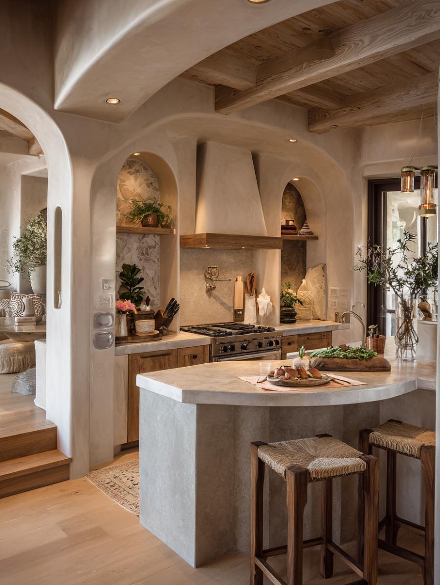 Soft plaster walls create flowing archways that frame this Mediterranean-inspired cooking space, where exposed oak ceiling beams add rustic texture overhead. Natural stone countertops complement the curved range hood, while woven rush bar stools provide casual seating at the rounded island. Recessed lighting illuminates built-in niches that showcase pottery and greenery, creating an inviting atmosphere perfect for intimate gatherings and slow cooking rituals.