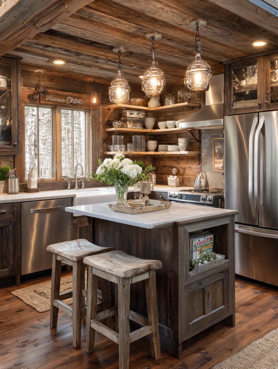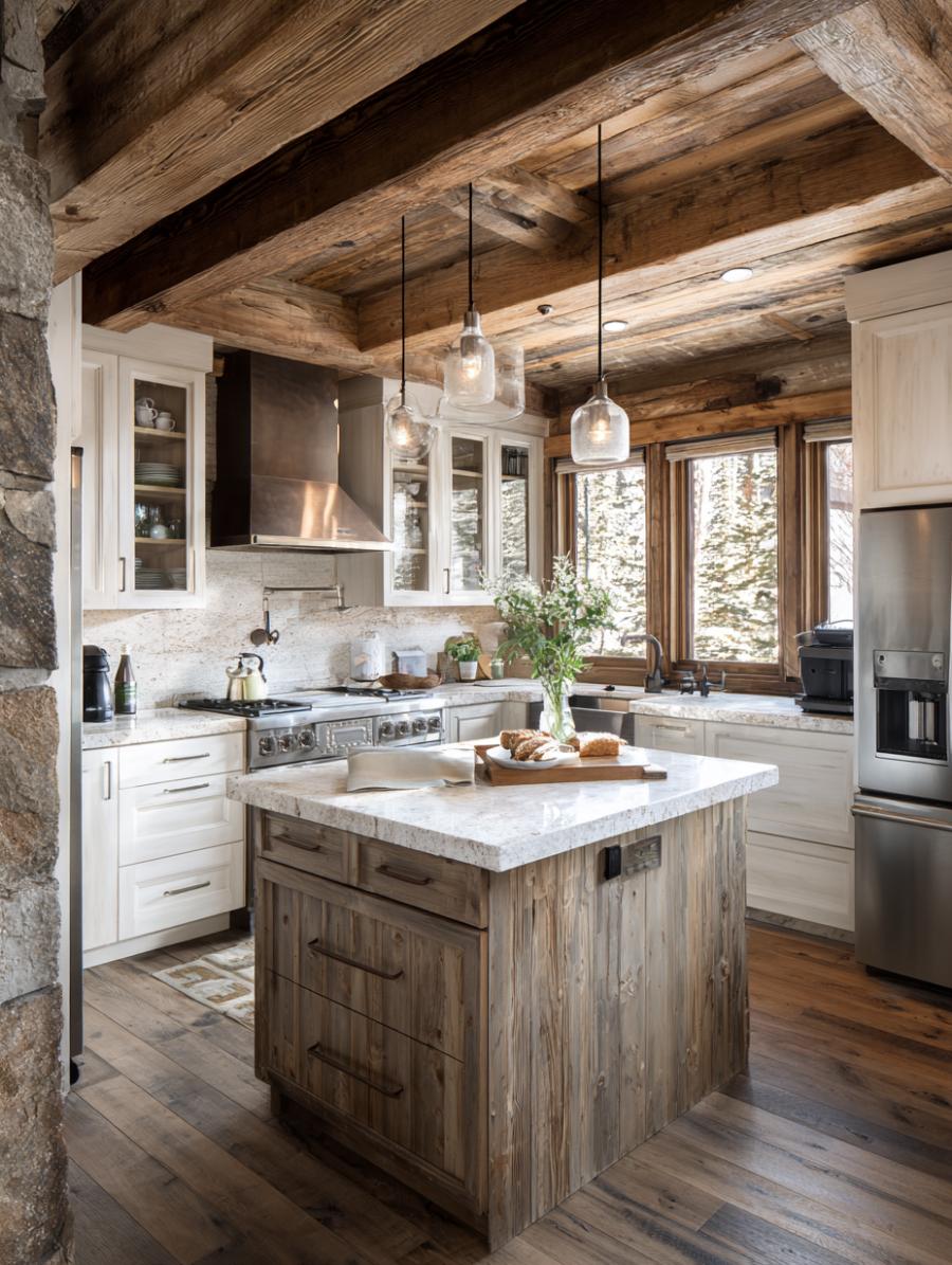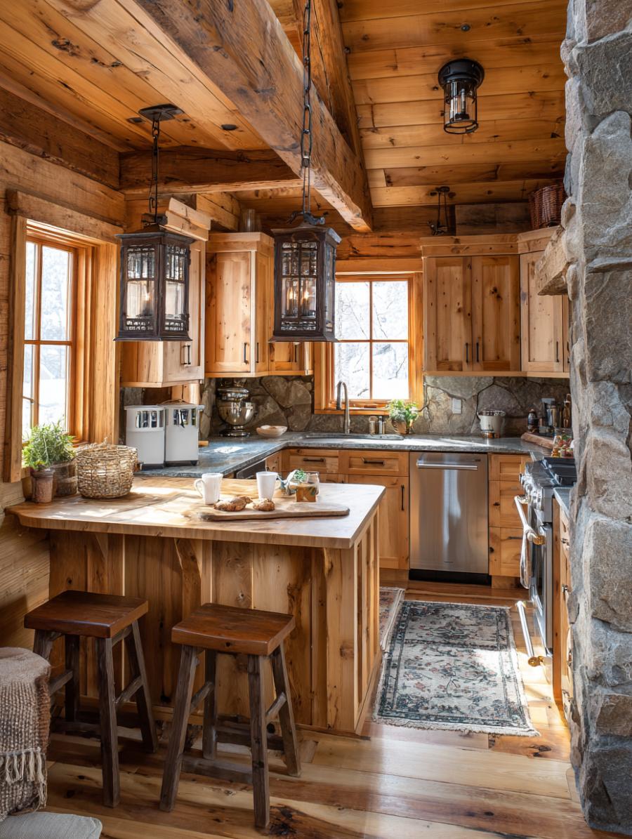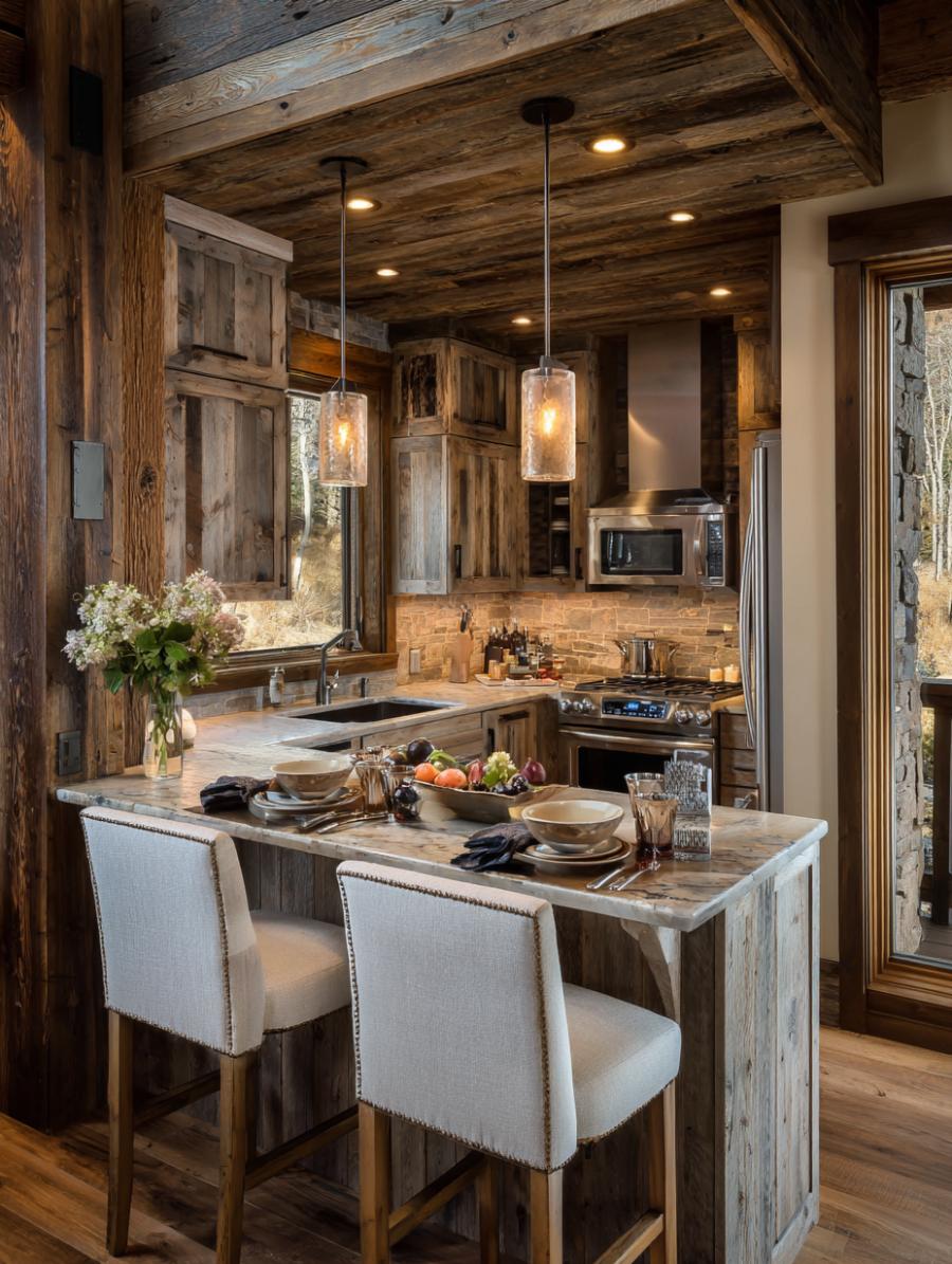Reclaimed wood beams stretch across the vaulted ceiling while natural stone creates a stunning focal wall in this cozy mountain retreat. Honey-toned log construction pairs beautifully with dark granite countertops and rustic pendant lighting. The compact island maximizes workspace without overwhelming the room, while strategically placed windows flood the space with natural light that highlights every warm wood grain.