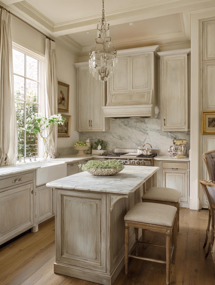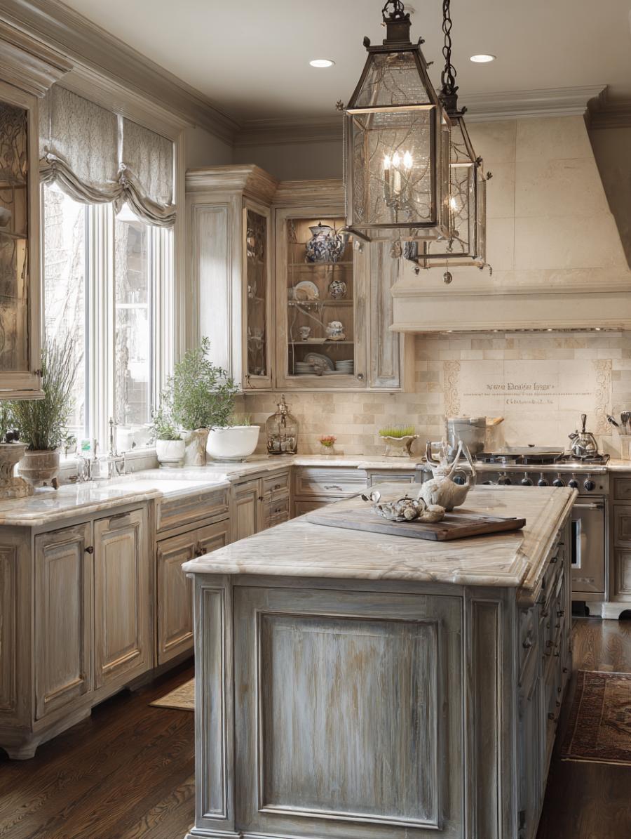 Weathered Wood Cabinets Meet Crystal Elegance in Compact French Country Space