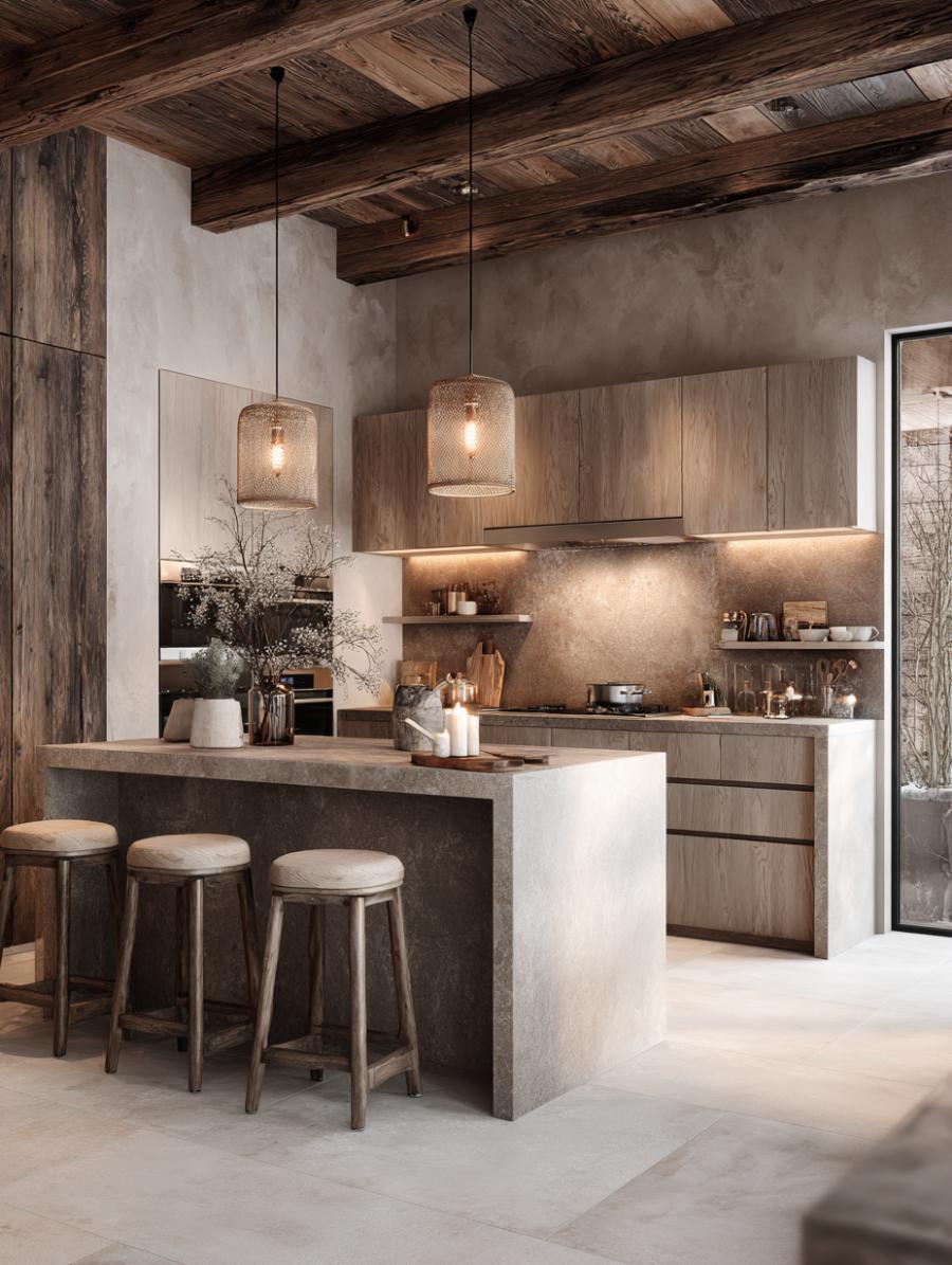 Exposed reclaimed wood ceiling beams create stunning contrast against crisp white walls and sleek stone surfaces. Natural wood cabinetry extends seamlessly across the kitchen, while woven pendant lights cast warm ambient glow over the concrete waterfall island. Round wooden bar stools echo the organic ceiling treatment, perfectly balancing contemporary functionality with rustic charm that invites lingering conversations.