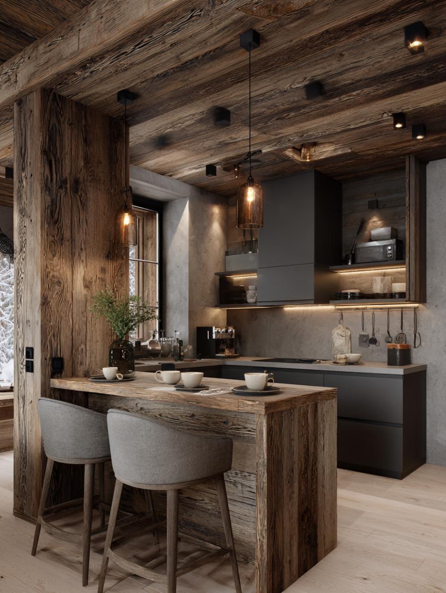 Weathered reclaimed wood creates stunning contrast against sleek charcoal cabinetry in this cozy mountain retreat kitchen. Exposed ceiling beams showcase natural grain patterns while pendant lights cast warm amber glows over the breakfast bar. Modern gray bar stools soften the rustic elements, and under-cabinet LED strips illuminate concrete countertops for perfect task lighting.