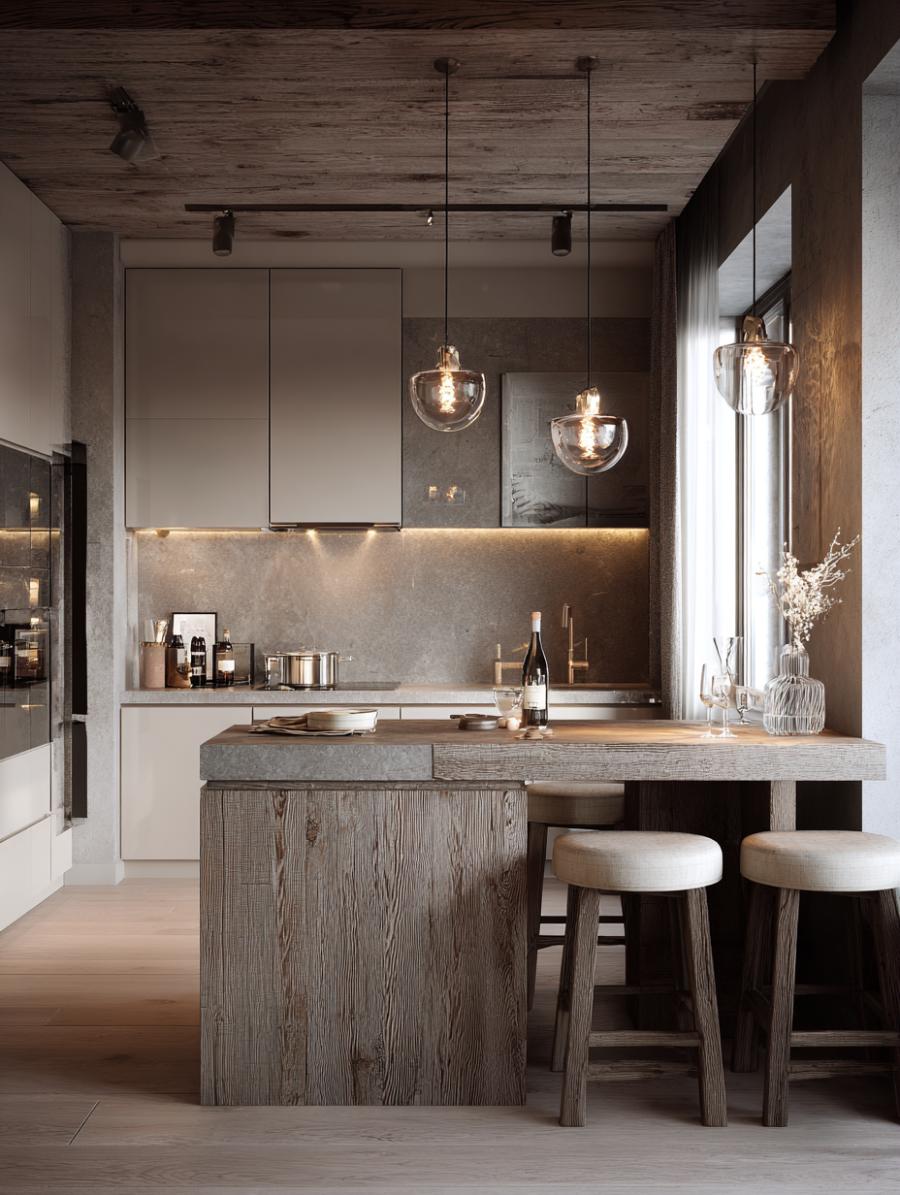 Natural wood textures dominate this compact kitchen, where weathered oak cabinetry pairs beautifully with sleek concrete countertops. Warm brass pendant lights cast an inviting glow over the breakfast bar, while under-cabinet LED strips illuminate the neutral stone backsplash. Round cushioned stools tuck neatly beneath the extended counter, maximizing every inch of space. Exposed wood ceiling beams add rustic charm without overwhelming the clean lines.