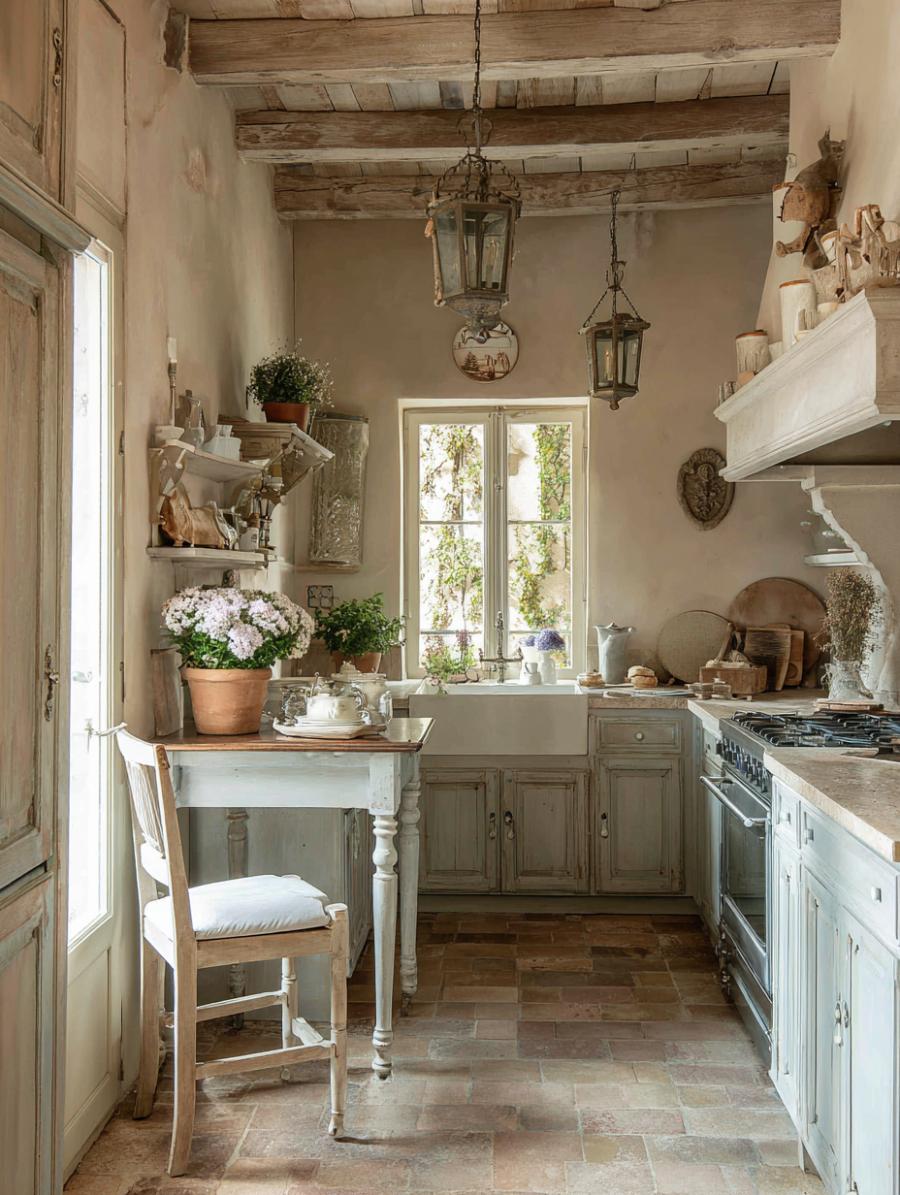 Exposed ceiling beams create dramatic architectural interest above sage green cabinets and weathered wood finishes. Natural light floods through French casement windows, illuminating terracotta planters filled with blooming hydrangeas. Stone tile flooring grounds the space while brass lantern pendants add warm ambient lighting. Open shelving displays vintage crockery and herbs, creating an authentic farmhouse atmosphere perfect for slow cooking.