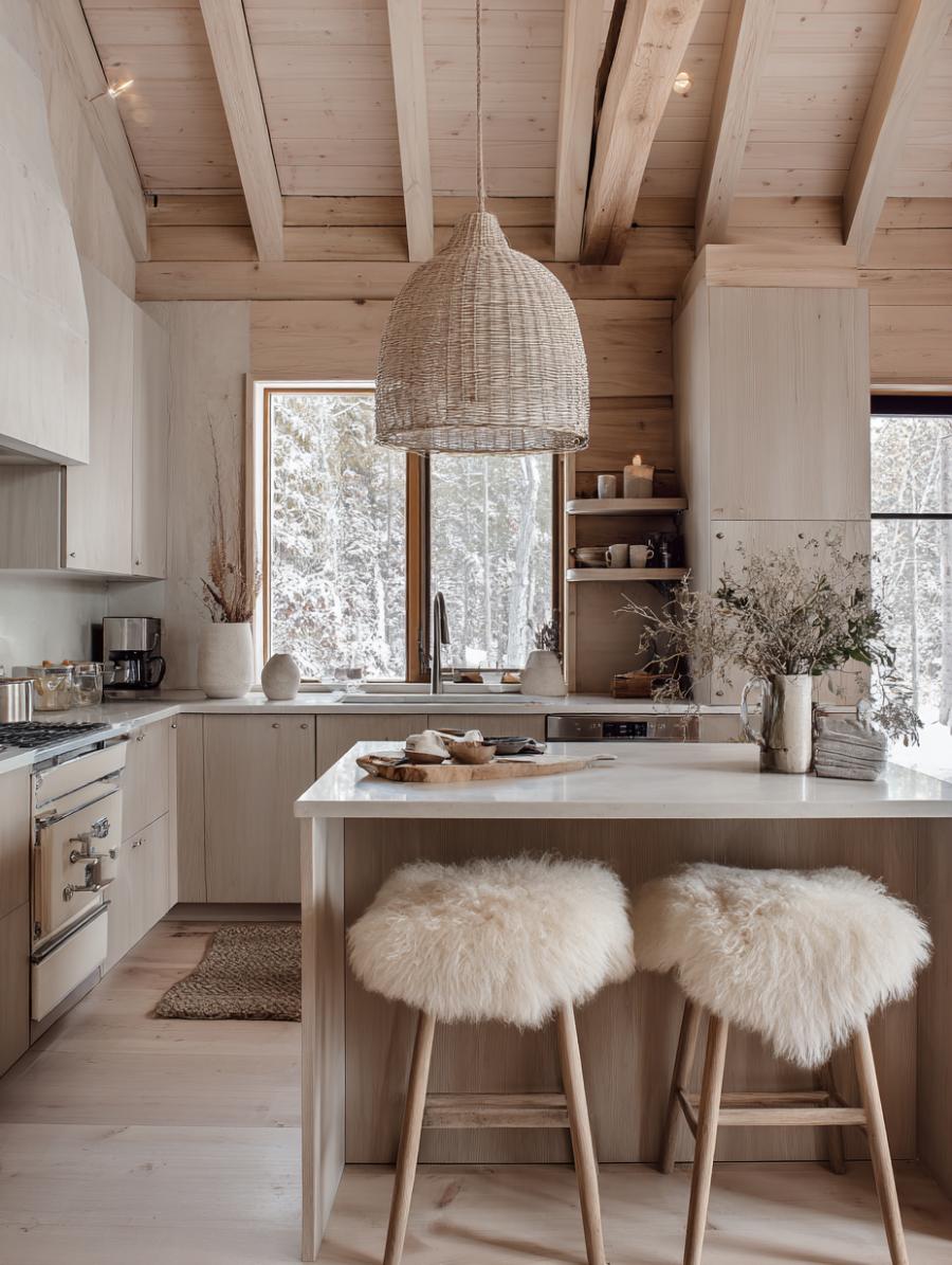 Exposed wood beams frame this cozy kitchen where natural materials create warmth and texture. The large woven rattan pendant light anchors the space above a pristine white island, while fluffy sheepskin bar stools add tactile comfort. Light oak cabinetry pairs beautifully with white countertops, creating a serene palette that lets winter views through the windows take center stage.
