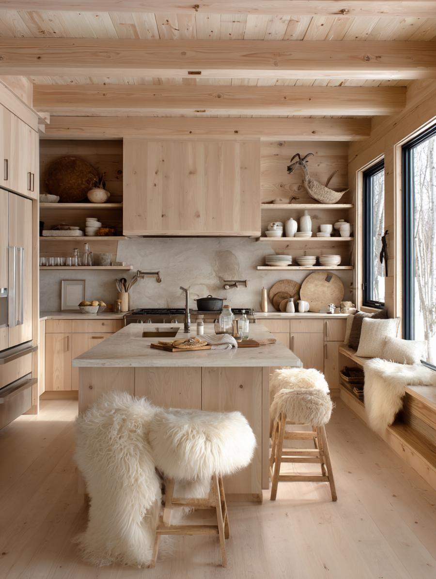 Natural blonde wood cabinetry creates an inviting Scandinavian atmosphere enhanced by dramatic exposed ceiling beams. Open shelving displays ceramic dishware and woven baskets, while a central island topped with light stone provides workspace and casual dining. Fluffy sheepskin seat cushions soften wooden bar stools, and large black-framed windows flood the space with natural light that highlights the warm wood grain throughout.