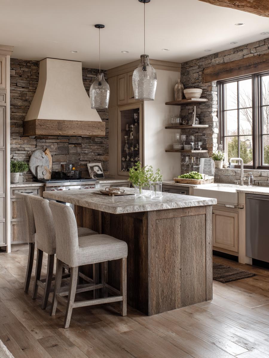 Stacked stone walls embrace honey oak cabinetry and a dramatic weathered wood island in this inviting design. Glass pendant lights cast gentle illumination over marble countertops, while floating shelves display earthy ceramics. Neutral upholstered barstools invite lingering conversations, and the creamy range hood anchors the cooking zone with rustic elegance.