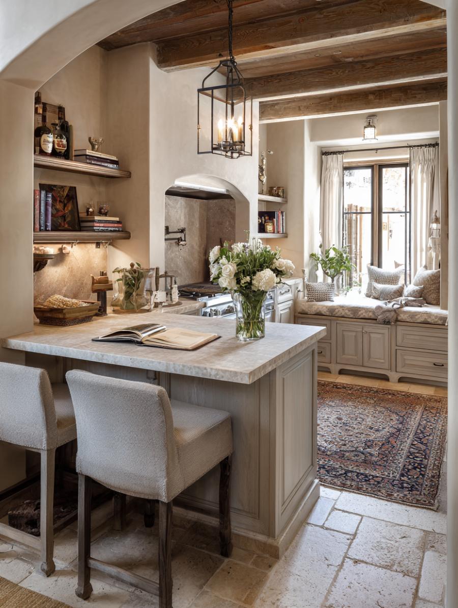 Natural wood beams frame this intimate kitchen where warm taupe cabinetry creates a soothing foundation. Built-in floating shelves display curated collections while a lantern-style pendant casts gentle light over the marble-topped island. The adjacent window seat, adorned with neutral cushions and throw pillows, transforms the breakfast nook into a reading retreat that perfectly balances rustic charm with refined comfort.
