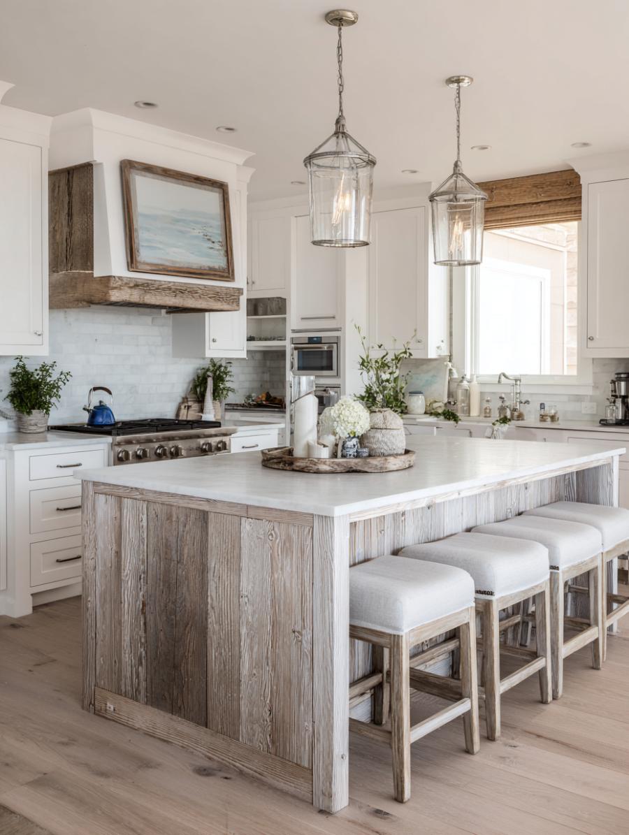 Weathered Wood Island Creates Cozy Coastal Kitchen Charm