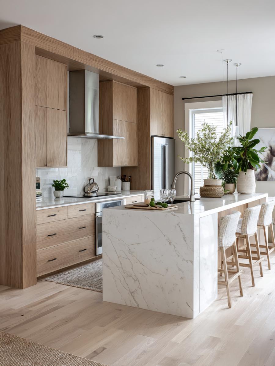 Warm Wood Cabinetry Meets Marble Island Elegance