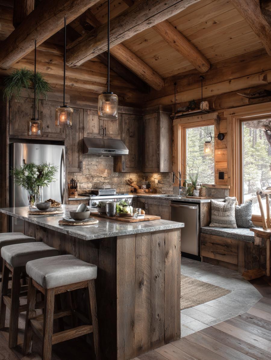 Weathered reclaimed wood cabinetry pairs beautifully with honed granite countertops in this mountain-inspired kitchen. Exposed beam ceilings create architectural drama while mason jar pendant lights cast warm ambient lighting over the central island. Bar stools with neutral linen cushions invite casual dining, and the built-in breakfast nook features plush throw pillows that enhance the hygge atmosphere.