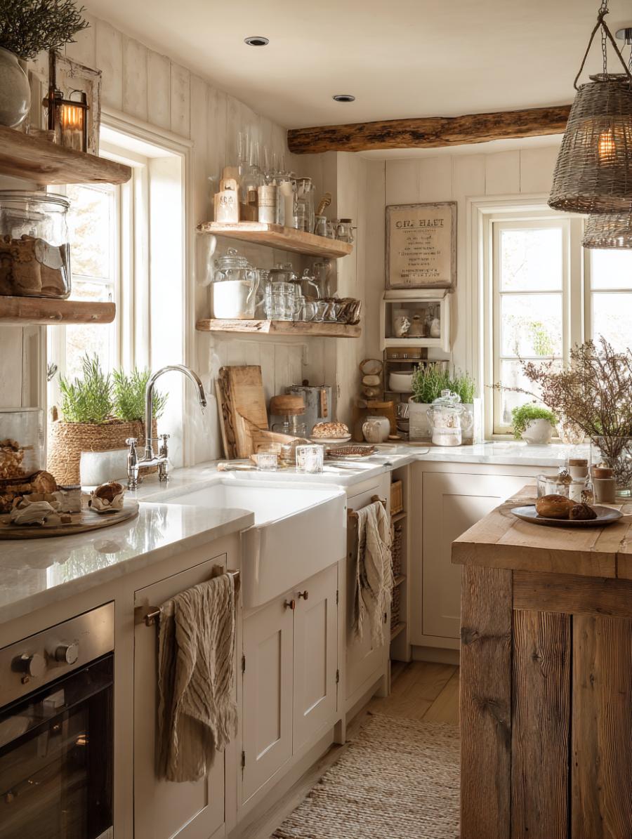 Creamy white shaker cabinets create a serene foundation while reclaimed wood beams and floating shelves add rustic character. Open shelving displays vintage glass jars and ceramic crocks, creating functional storage with farmhouse charm. Natural light streams through white-trimmed windows, illuminating herb planters and woven baskets that bring organic textures into this compact yet welcoming space.