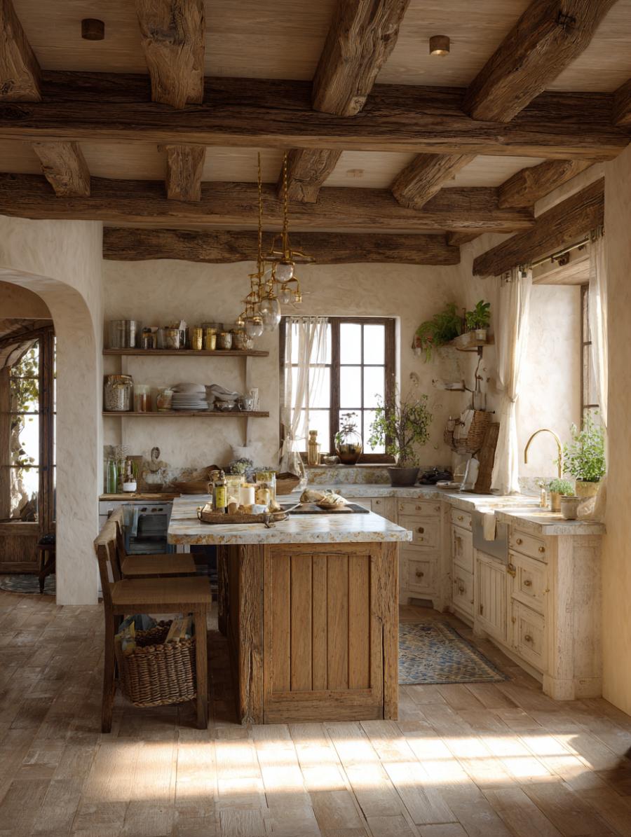 Weathered Wood Beams Frame This Cozy French Country Cooking Haven