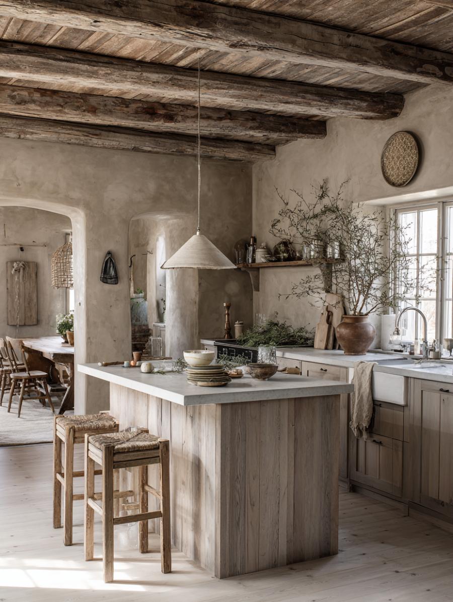 Exposed ceiling beams frame this enchanting rustic kitchen where weathered wood cabinetry meets creamy plaster walls. Natural light floods through vintage-style windows, illuminating the generous stone countertop island that anchors the space. Woven bar stools and earthenware pottery add authentic hygge touches, while dried branches in ceramic vessels bring organic warmth to every corner.