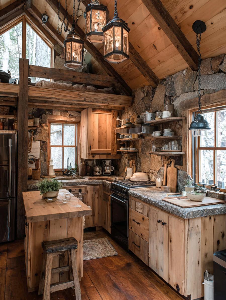 Natural stone walls create stunning contrast against warm wood cabinetry in this cozy mountain retreat kitchen. Rustic lantern pendant lights dangle from exposed ceiling beams, casting intimate light over granite countertops. Open wooden shelving displays earthenware pottery and everyday essentials, while a compact wooden island provides additional workspace. Wide plank floors and multiple windows maintain brightness despite the rich, earthy material palette throughout.