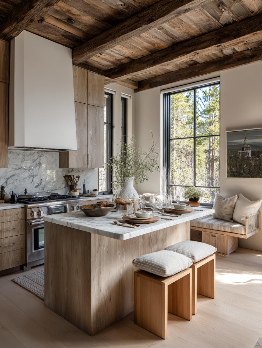 Reclaimed wood ceiling beams create dramatic overhead texture while light oak cabinetry maintains warmth without overwhelming the compact layout. Marble countertops and backsplash add luxurious contrast against the rustic elements. Built-in banquette seating maximizes the corner space, offering intimate dining while wooden cube stools provide flexible additional seating that tucks neatly under the waterfall-edge island.