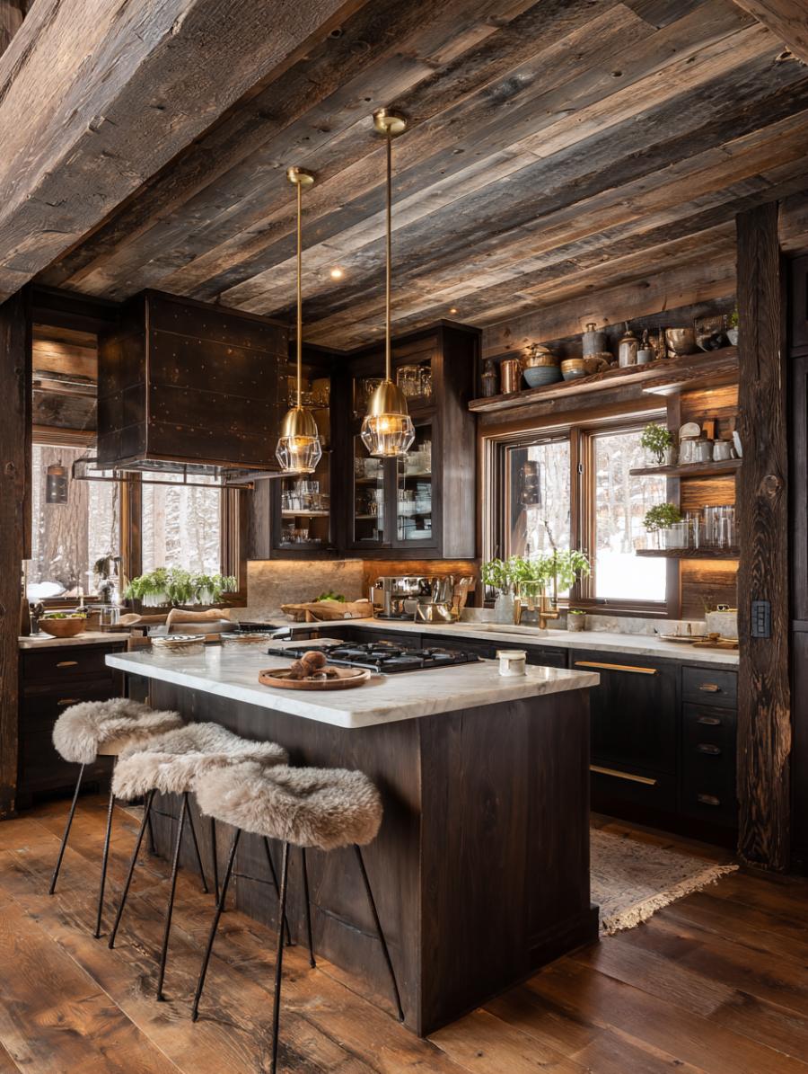 Reclaimed wood ceiling beams create stunning visual depth while woven rattan pendant lights cast warm, dappled shadows across rich walnut cabinetry. Sheepskin throws draped over live-edge counter stools invite lingering conversations by the crackling stone fireplace. Large windows frame snow-dusted trees, bringing nature’s serenity indoors while copper range accents add sophisticated warmth to this cozy gathering space.