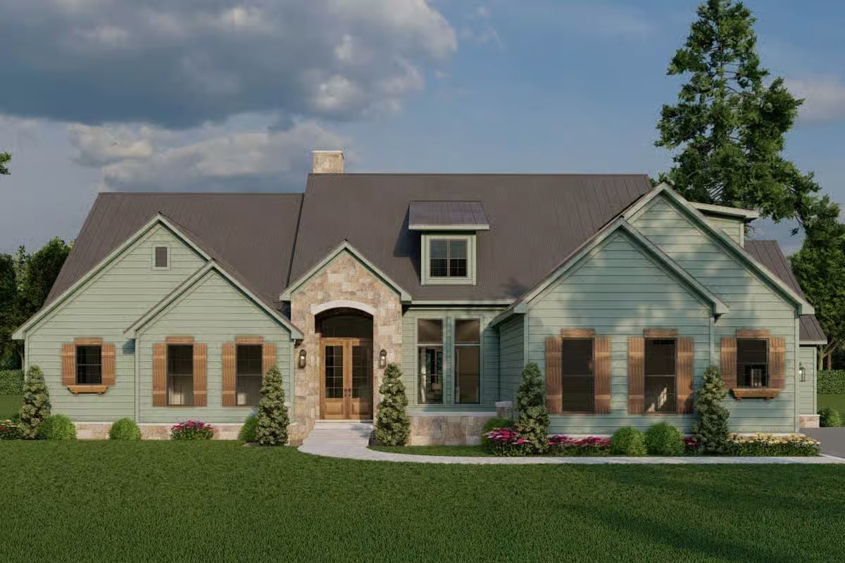 This craftsman-inspired farmhouse blends classic detailing with a clean, updated profile. A mix of siding and stone, a prominent arched entry, and a steep roofline give the exterior a refined but approachable look that feels well-balanced and residential.