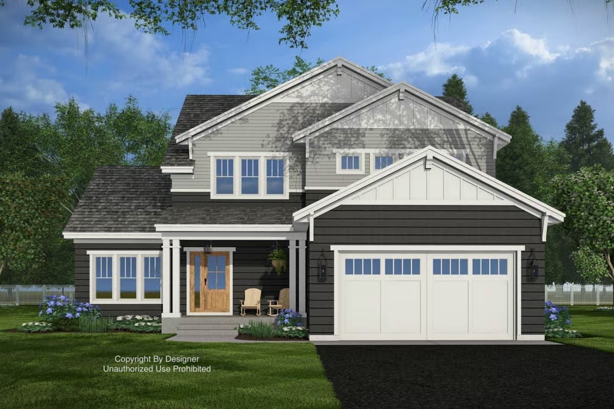 This modern craftsman-inspired design delivers strong curb appeal with clean horizontal siding, layered gables, and a welcoming covered porch that creates a comfortable front entry. Crisp trim and balanced windows give the exterior a polished, updated look, while the attached two-car garage keeps the home practical for everyday living.
