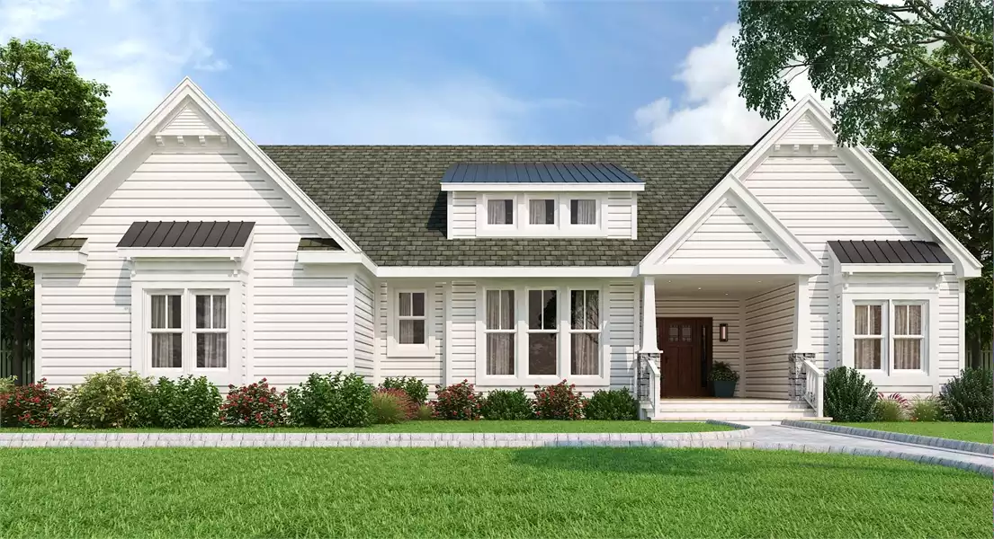 This single-story layout features an open great room and kitchen area anchored by a master suite with dual walk-in closets. Two additional bedrooms occupy the right wing. The home includes a covered porch, patio, and two-car garage with utility access.