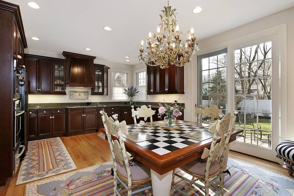 Centered around a unique checkered dining table, this kitchen opens onto a patio with large sliding glass doors. Dark cabinets and natural hardwood flooring complete the picture.