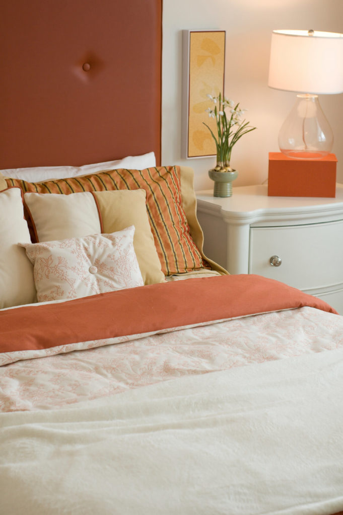 The deep peachy salmon splashes of color throughout this room offer a nice contrast against the blanch backdrop and furnishings. Striped accent pillows host a series of smaller neutral pillows, with a lovely white rectangular patterned piece in front.