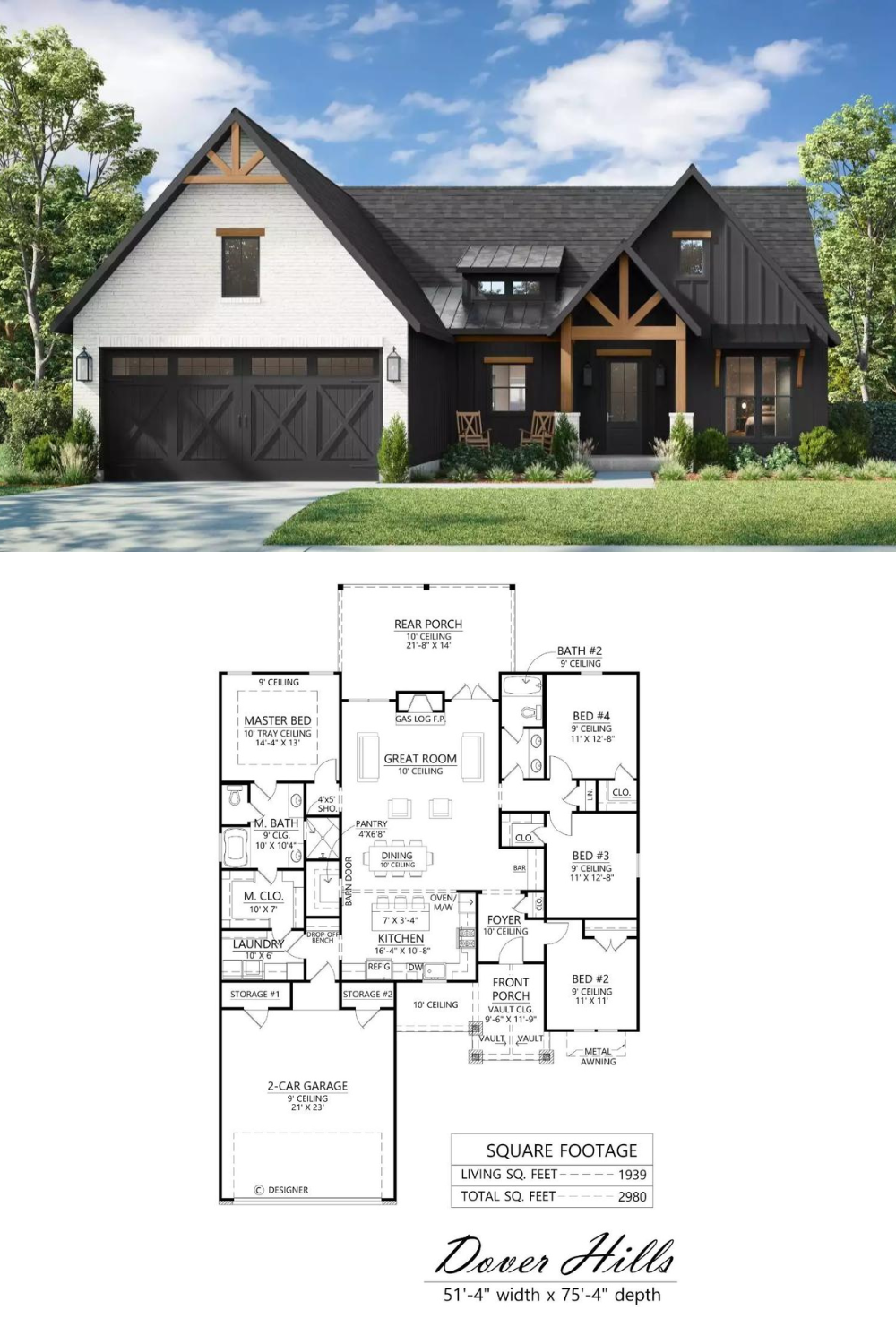 The Dover Hills is a stunning 1,939-square-foot one-story modern farmhouse designed with both charm and practicality in mind. Featuring four bedrooms and two bathrooms, this home offers a thoughtful layout with vaulted ceilings in the foyer, great room, and primary suite, creating a bright and airy feel throughout.