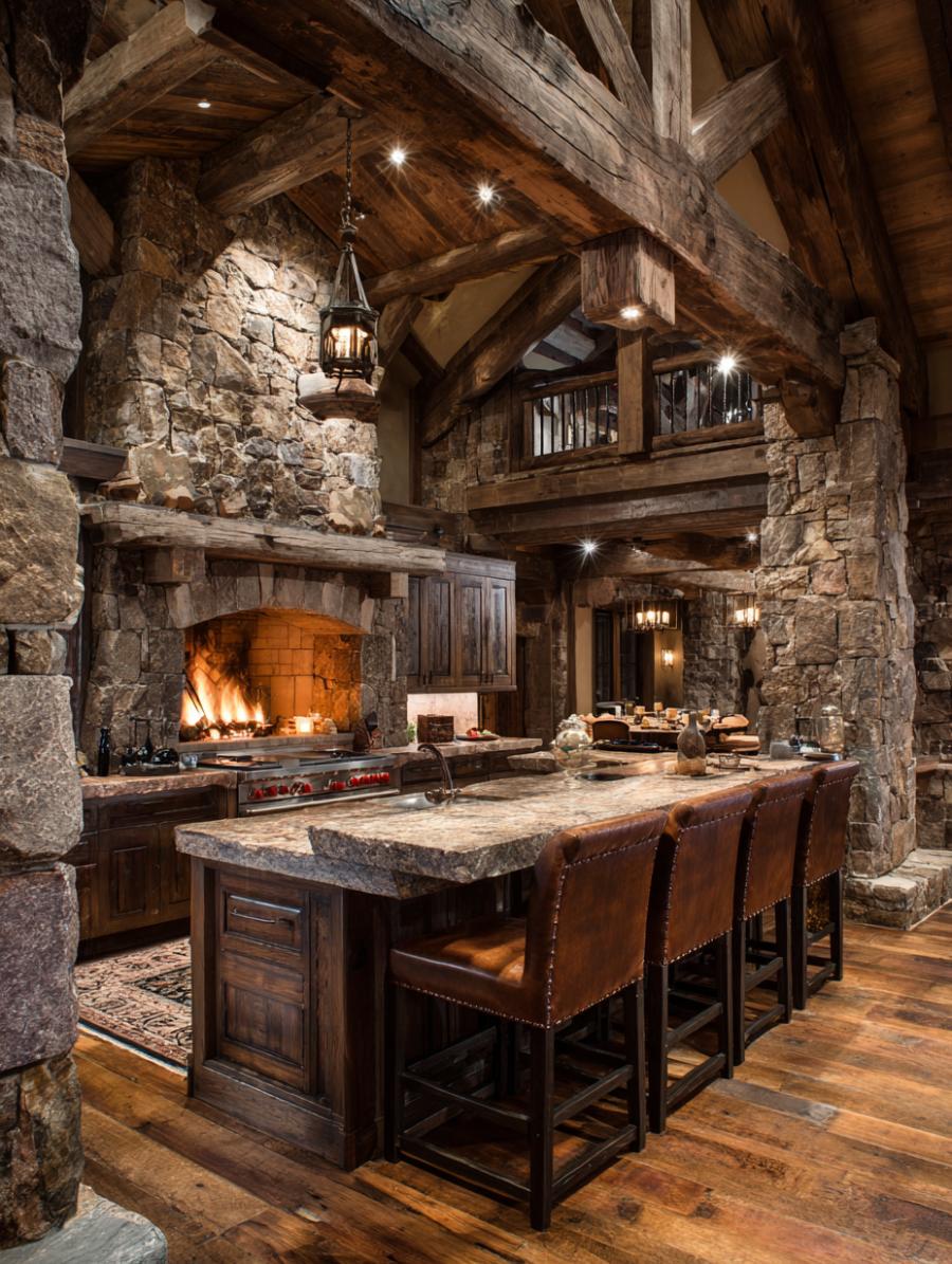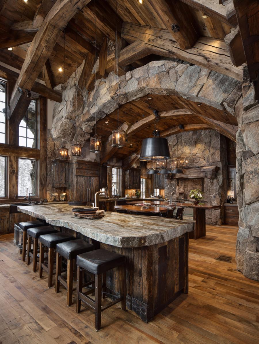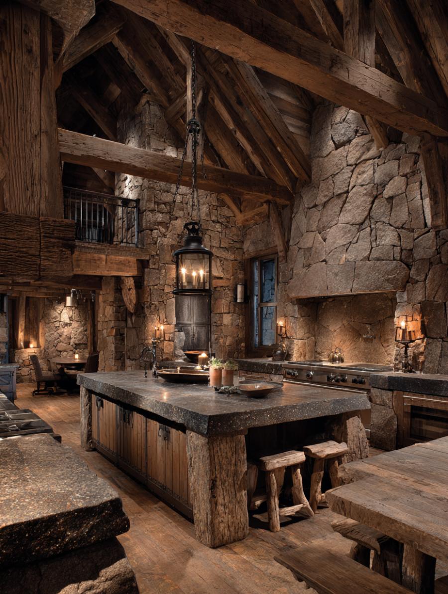 Majestic Rustic Lodge Kitchen with Dramatic Stonework