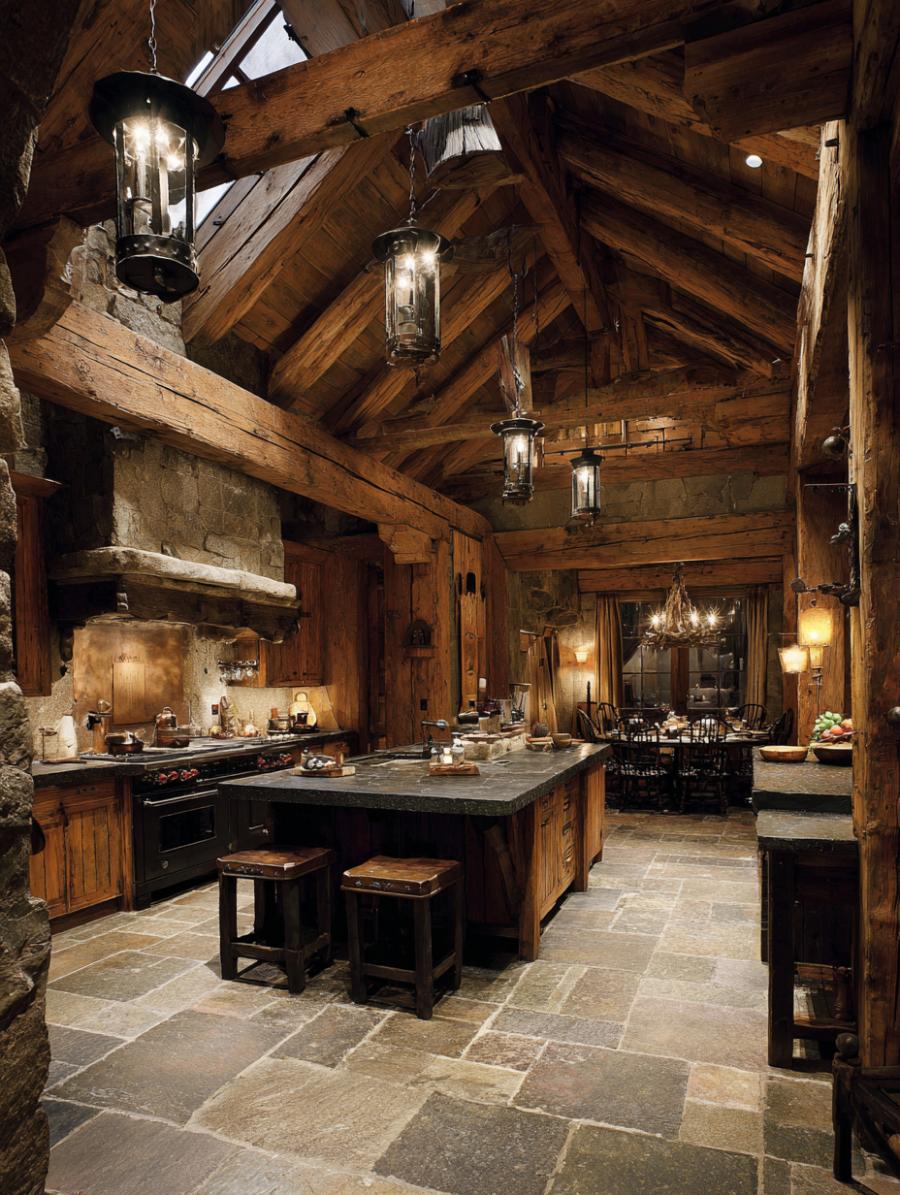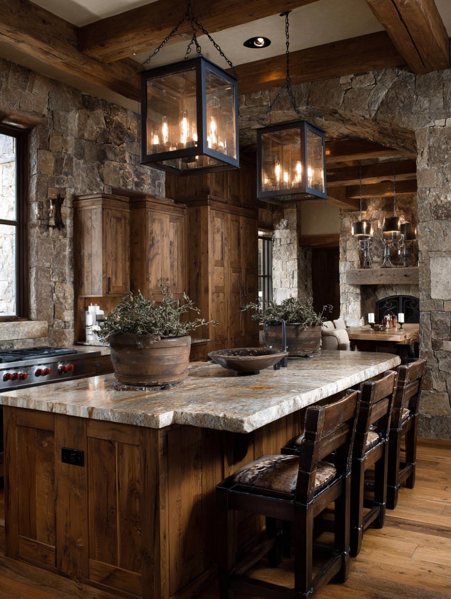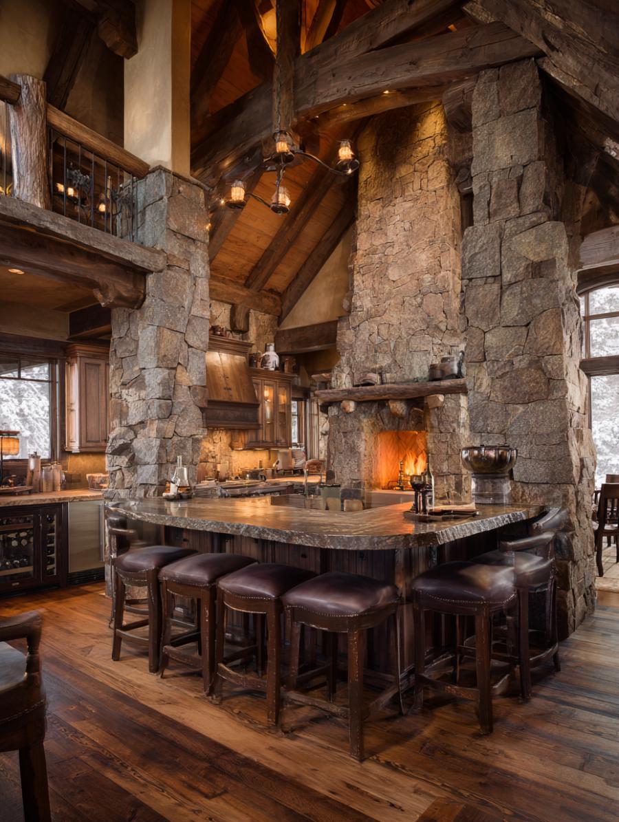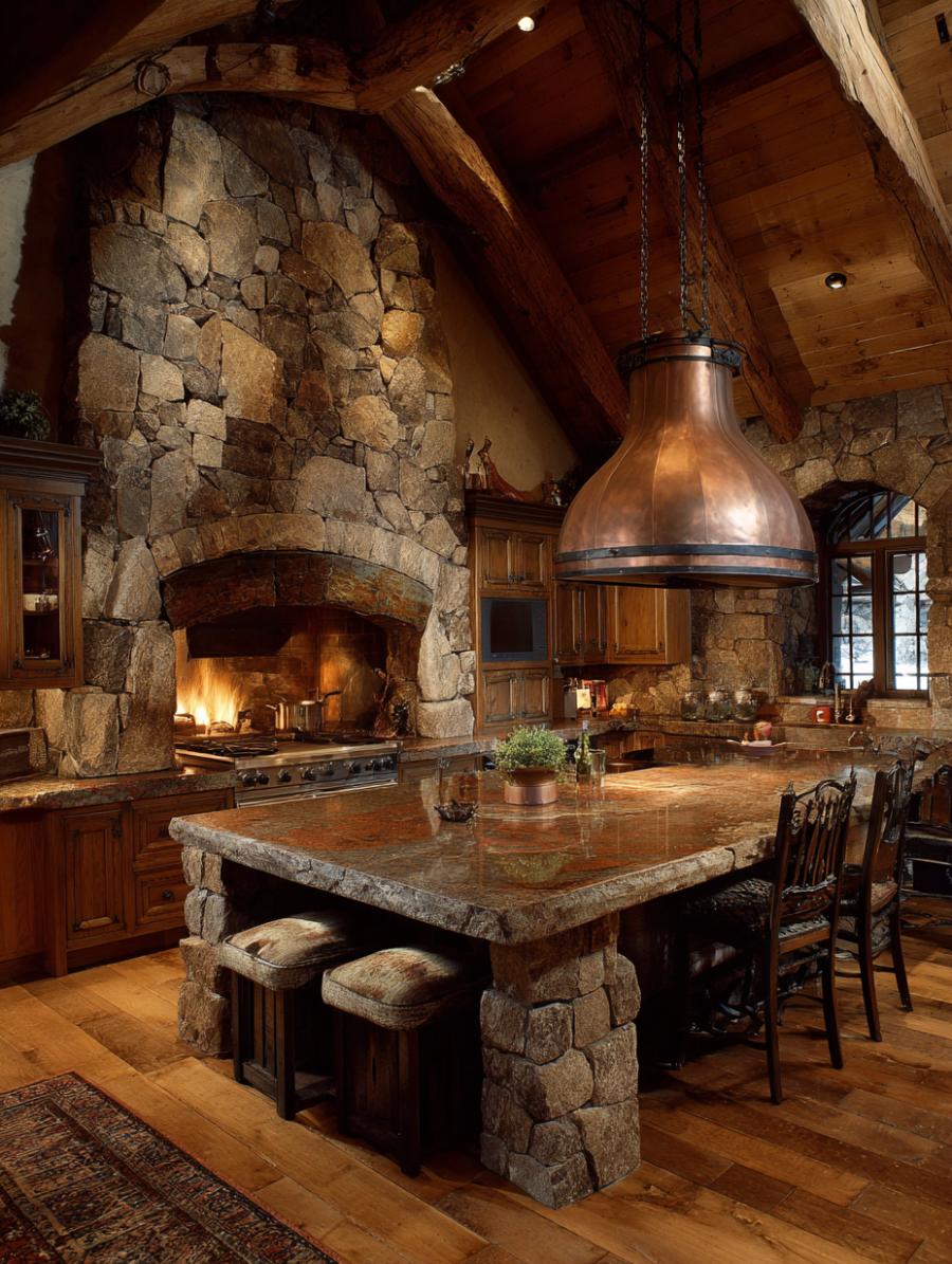 Majestic Rustic Lodge Kitchen with Dramatic Stonework