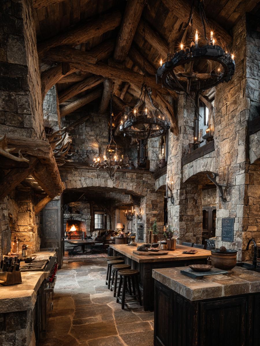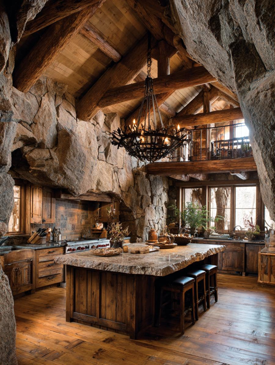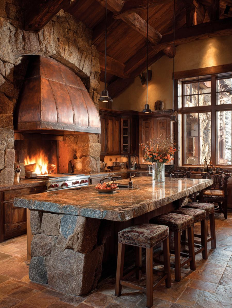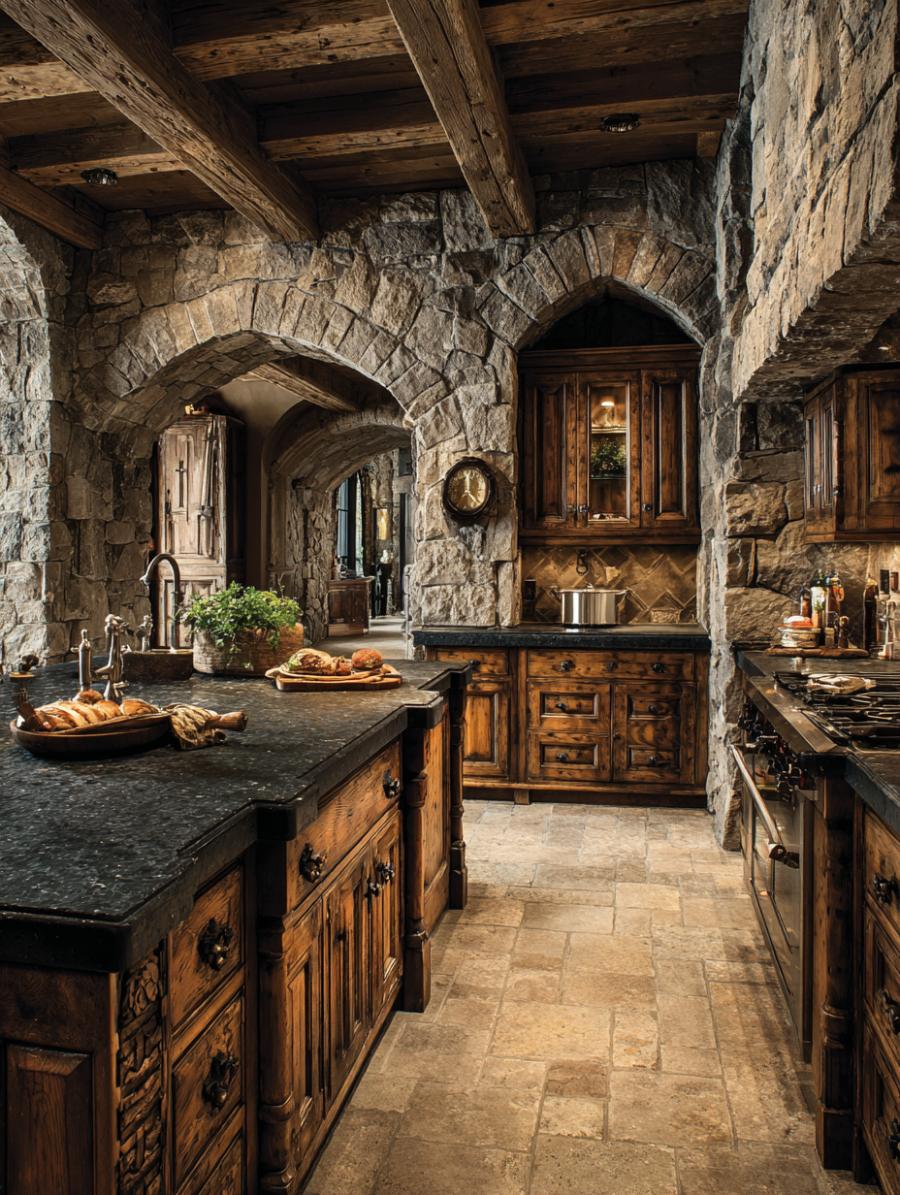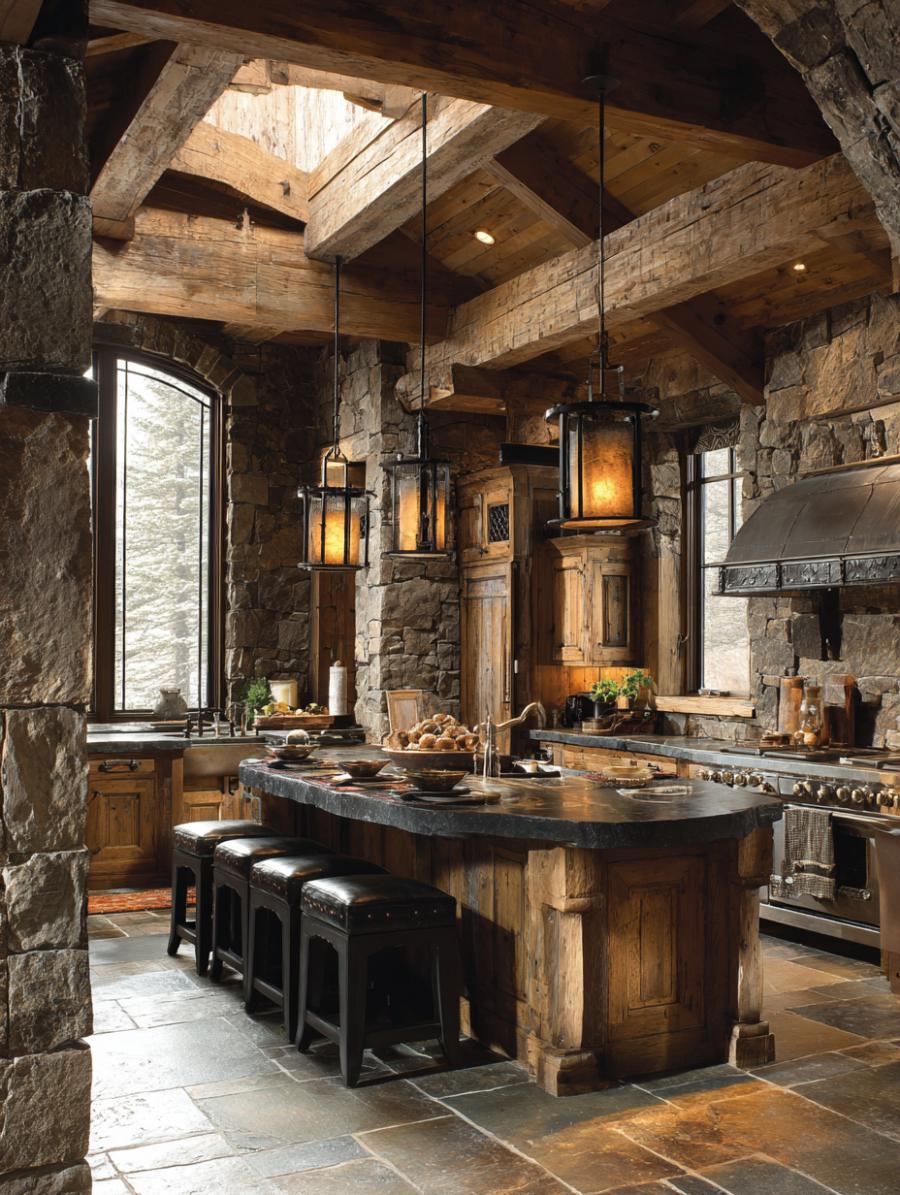 Massive stone elements and rich timberwork define this lodge-inspired kitchen, giving it a bold and impressive presence. The warm palette and rugged textures balance strength with inviting comfort. It feels like the centerpiece of a luxurious mountain retreat built for gathering and cooking.