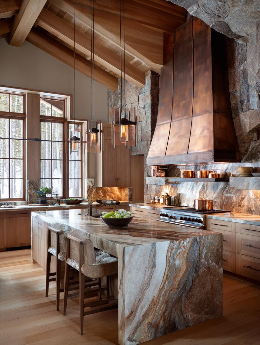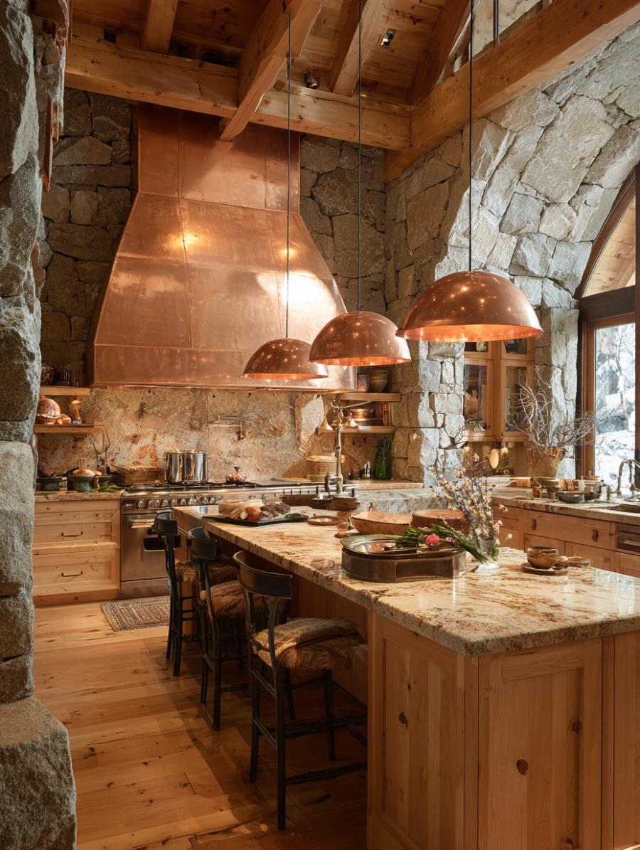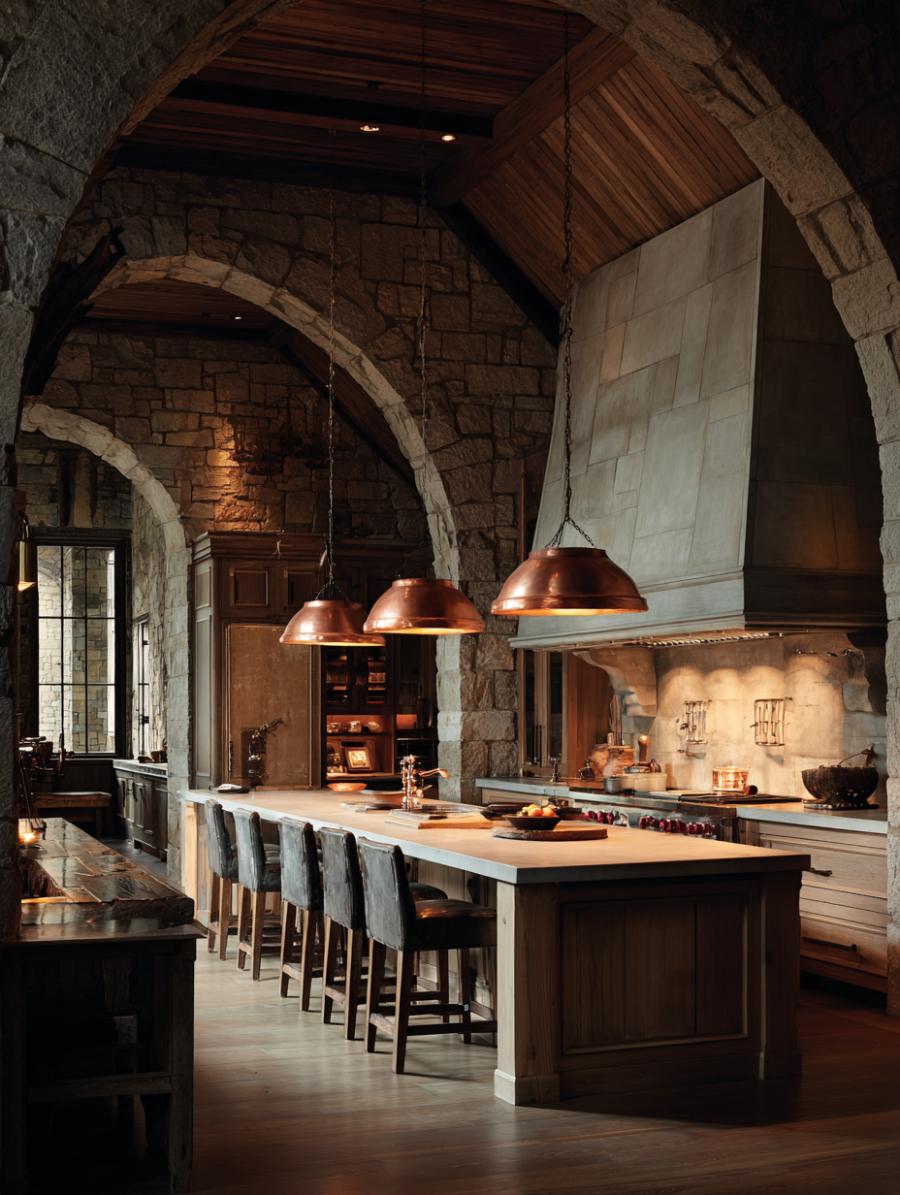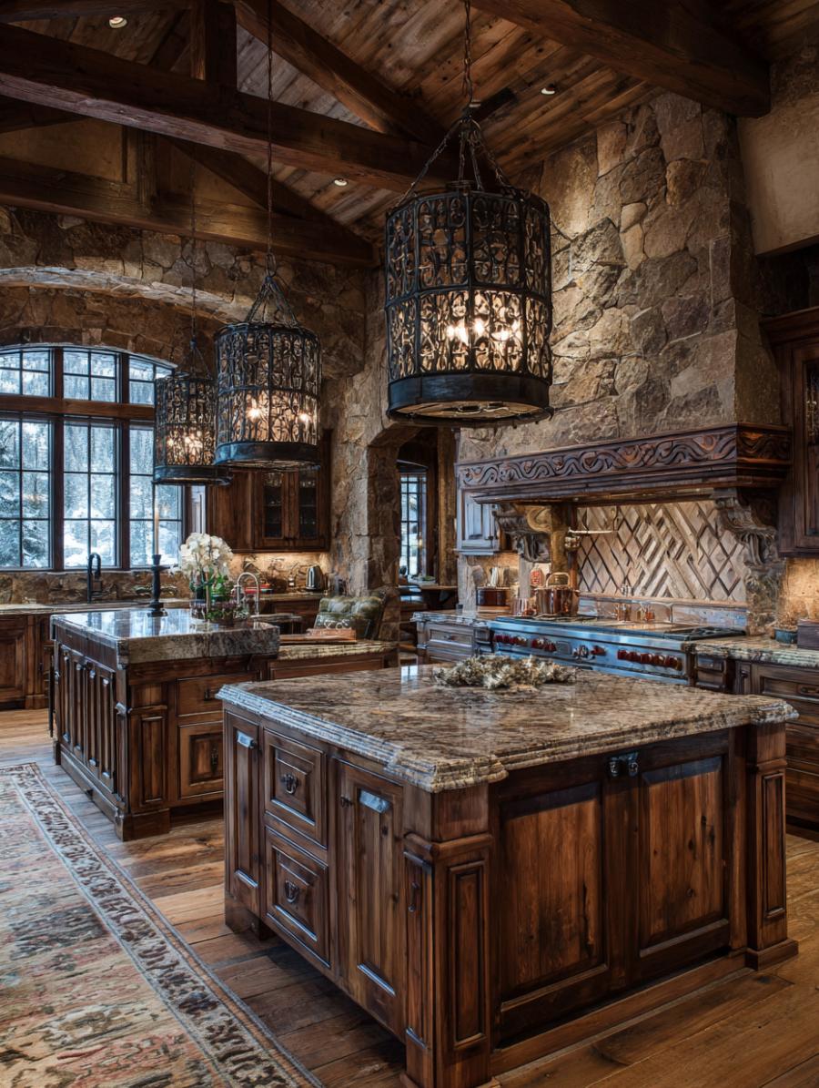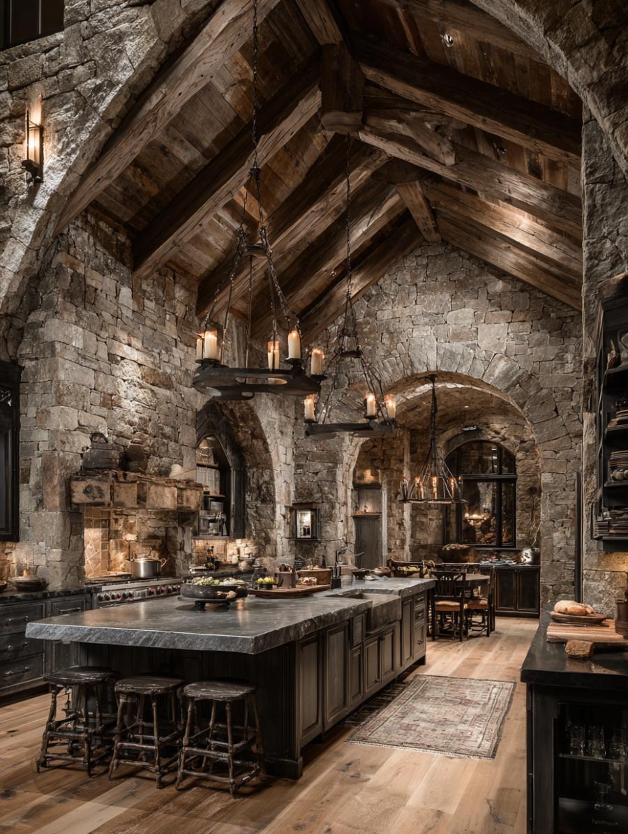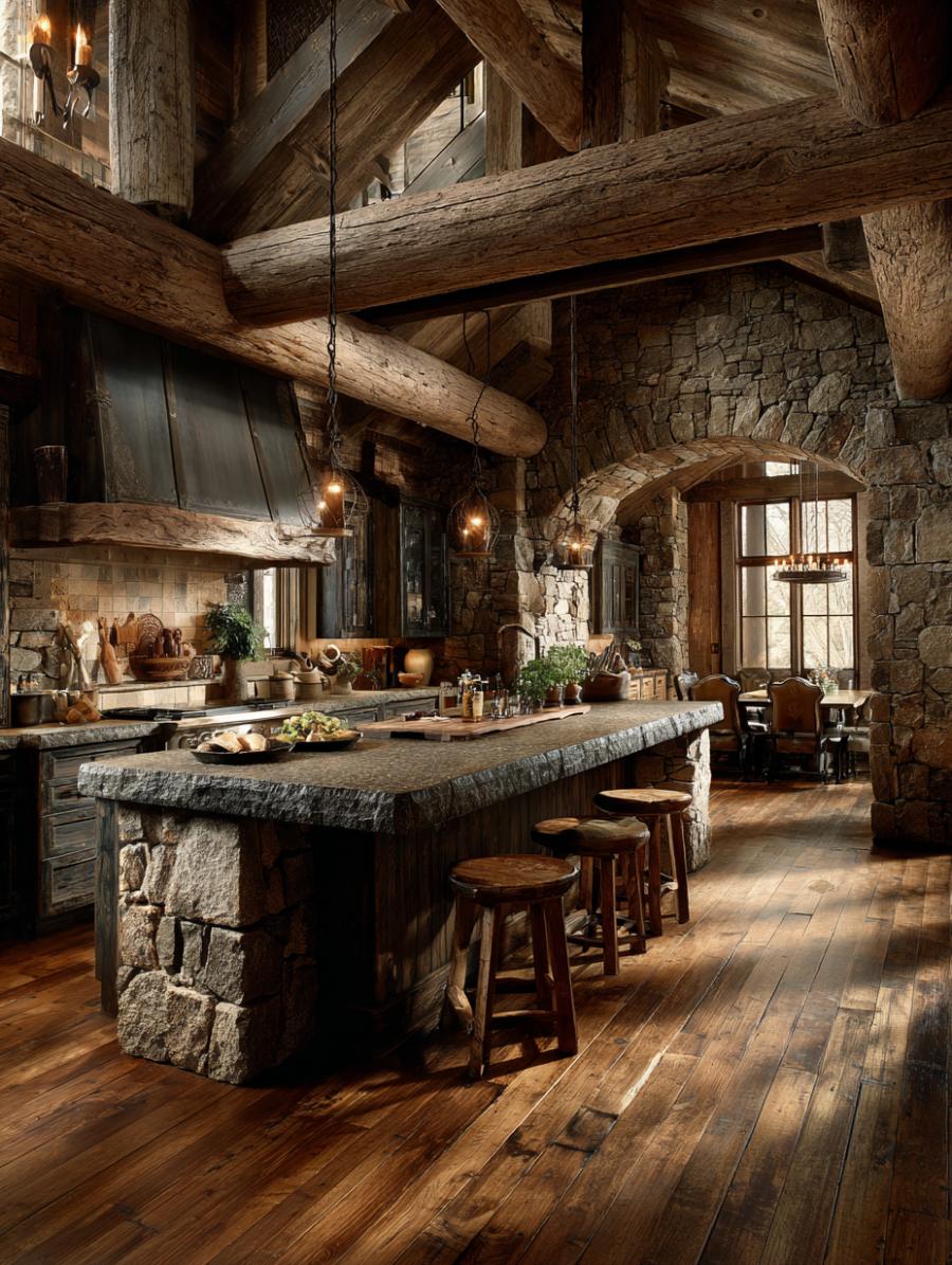 Massive stone elements and rich timberwork define this lodge-inspired kitchen, giving it a bold and impressive presence. The warm palette and rugged textures balance strength with inviting comfort. It feels like the centerpiece of a luxurious mountain retreat built for gathering and cooking.