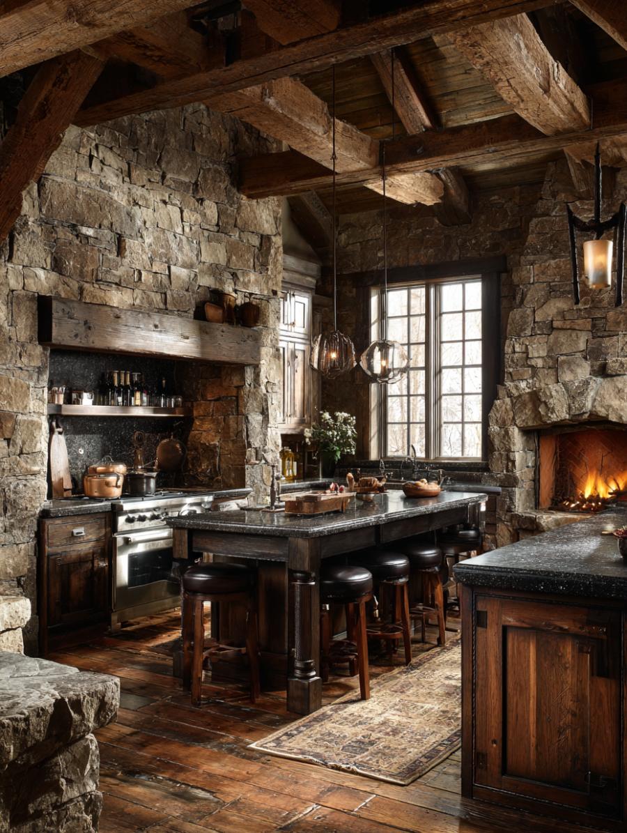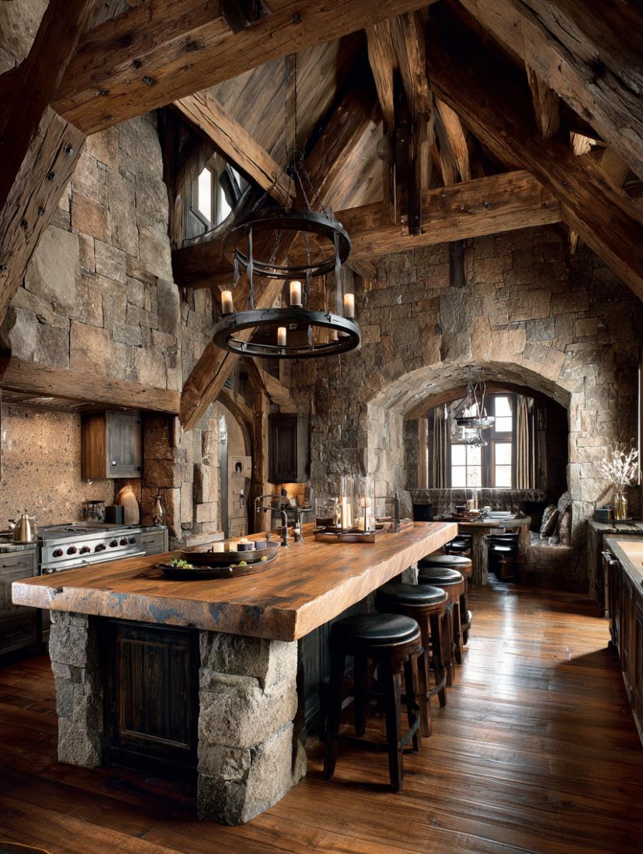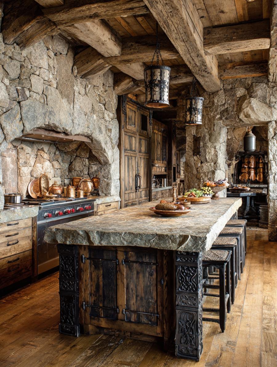 Bold Rustic Kitchen with Blackened Beams and Rugged Stone Elements