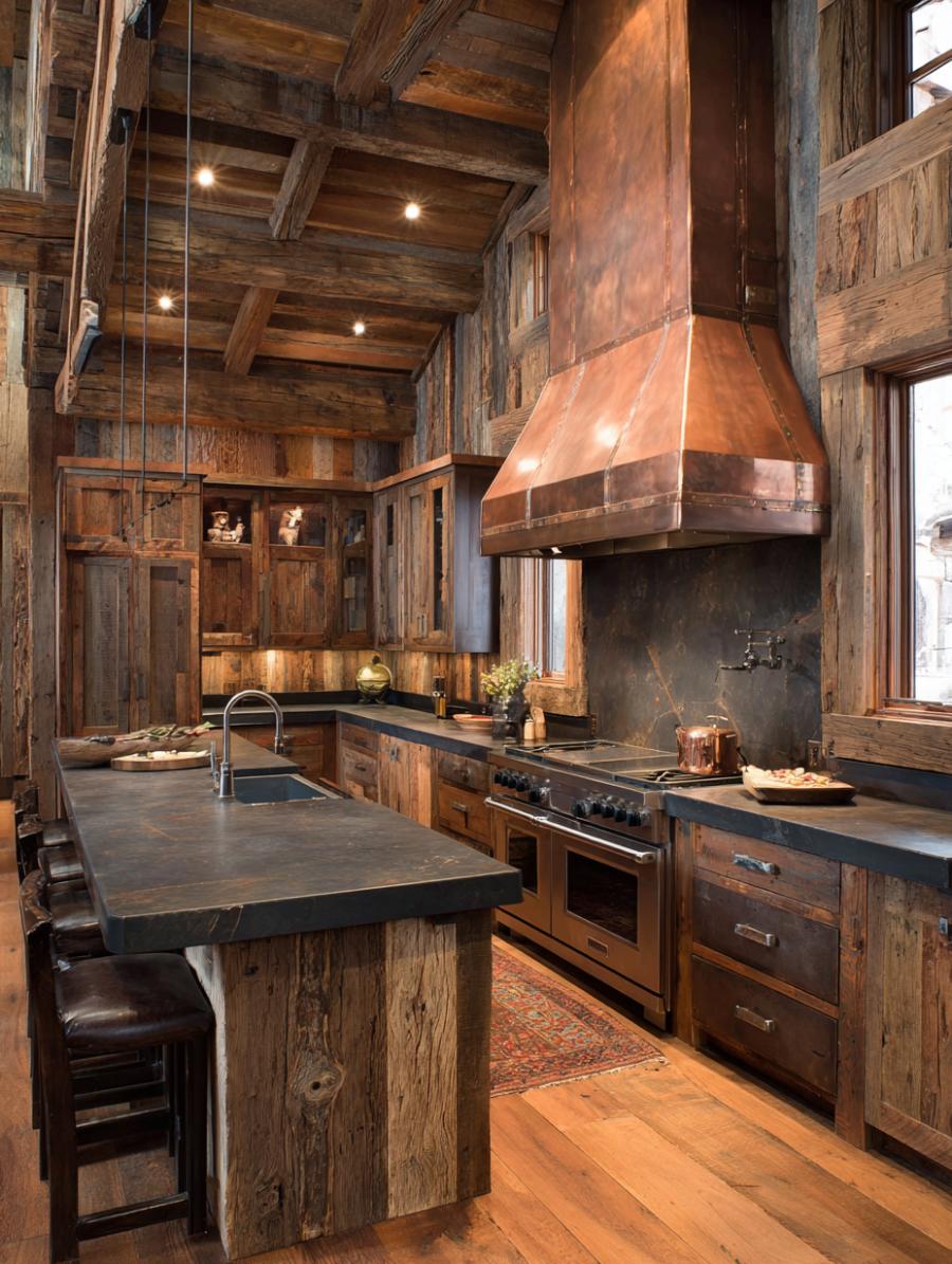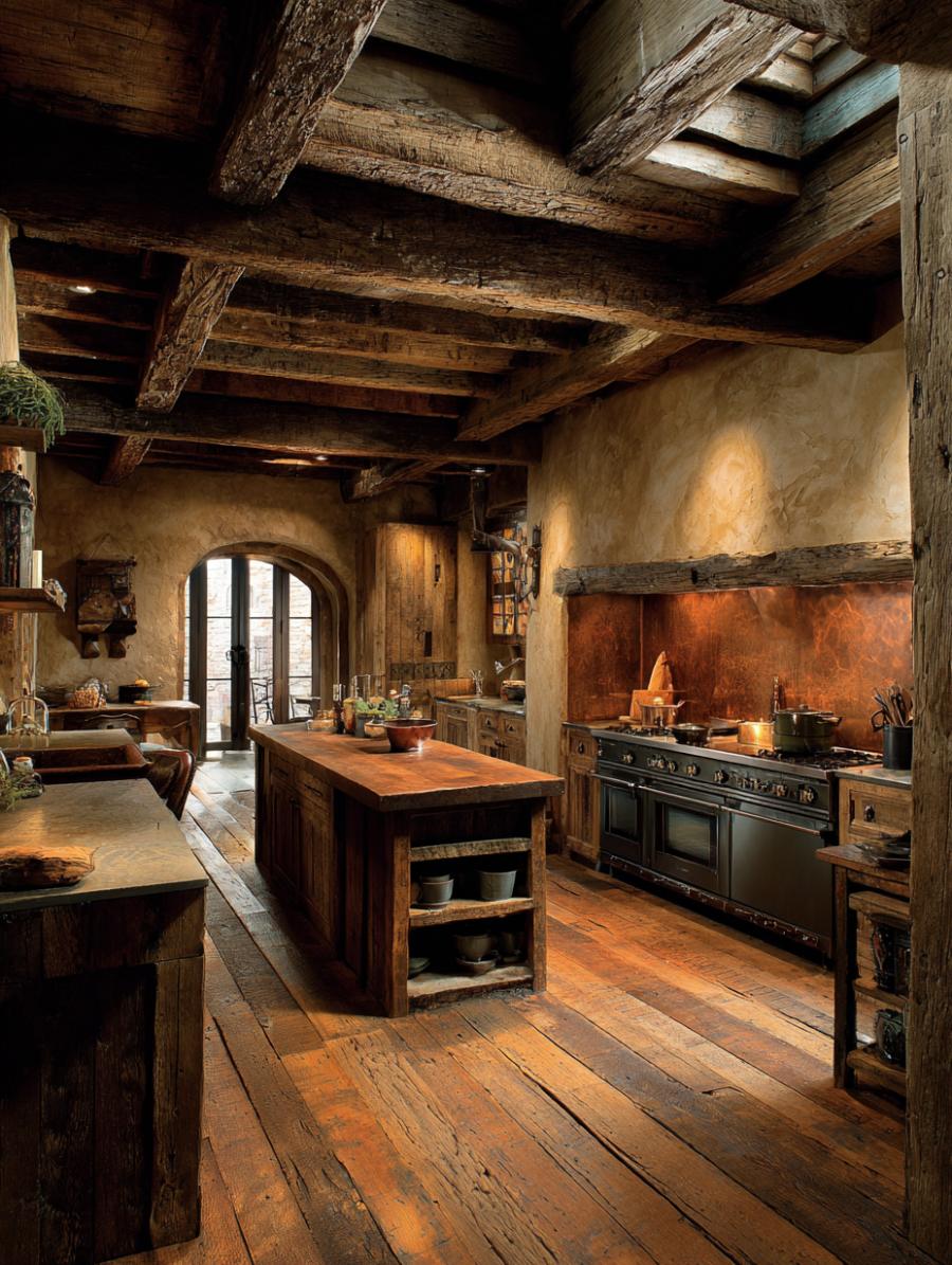 Luxury Rustic Retreat Kitchen with Reclaimed Wood and Stone Hearth