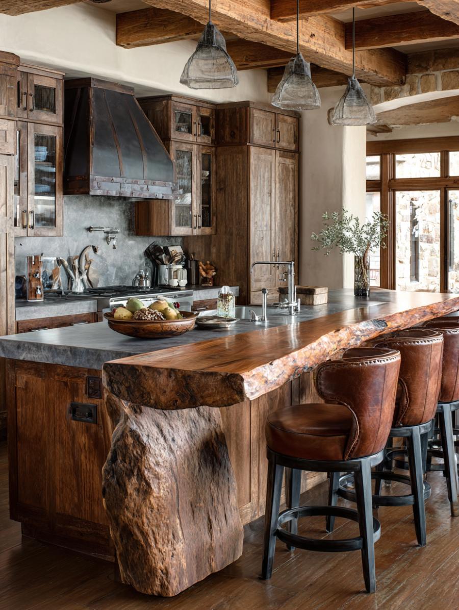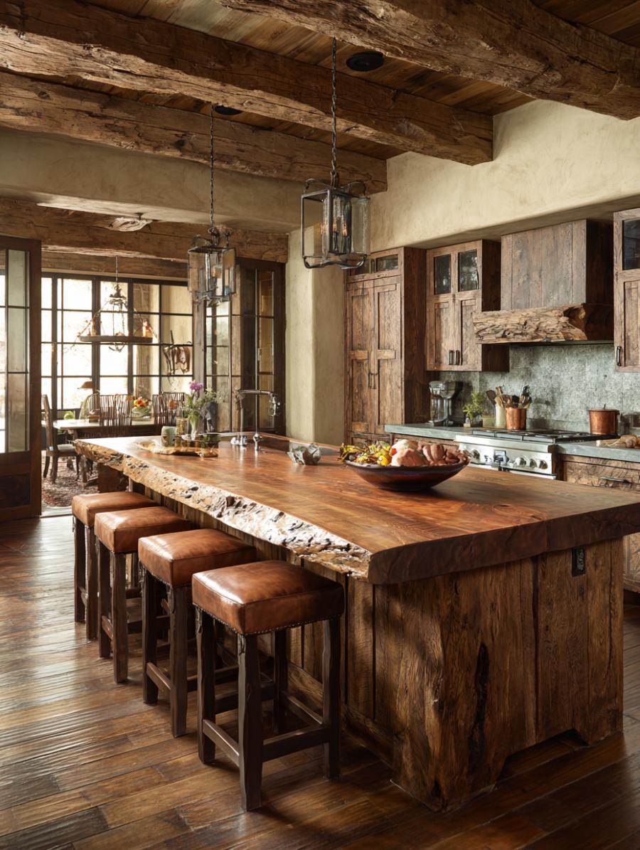 Rich wood grains and layered rustic textures define this ranch-style kitchen, where a natural live-edge island anchors the room. The surrounding cabinetry and beams emphasize authenticity, while soft ambient lighting highlights the warm, earthy palette. It’s a comforting yet luxurious take on rural design.