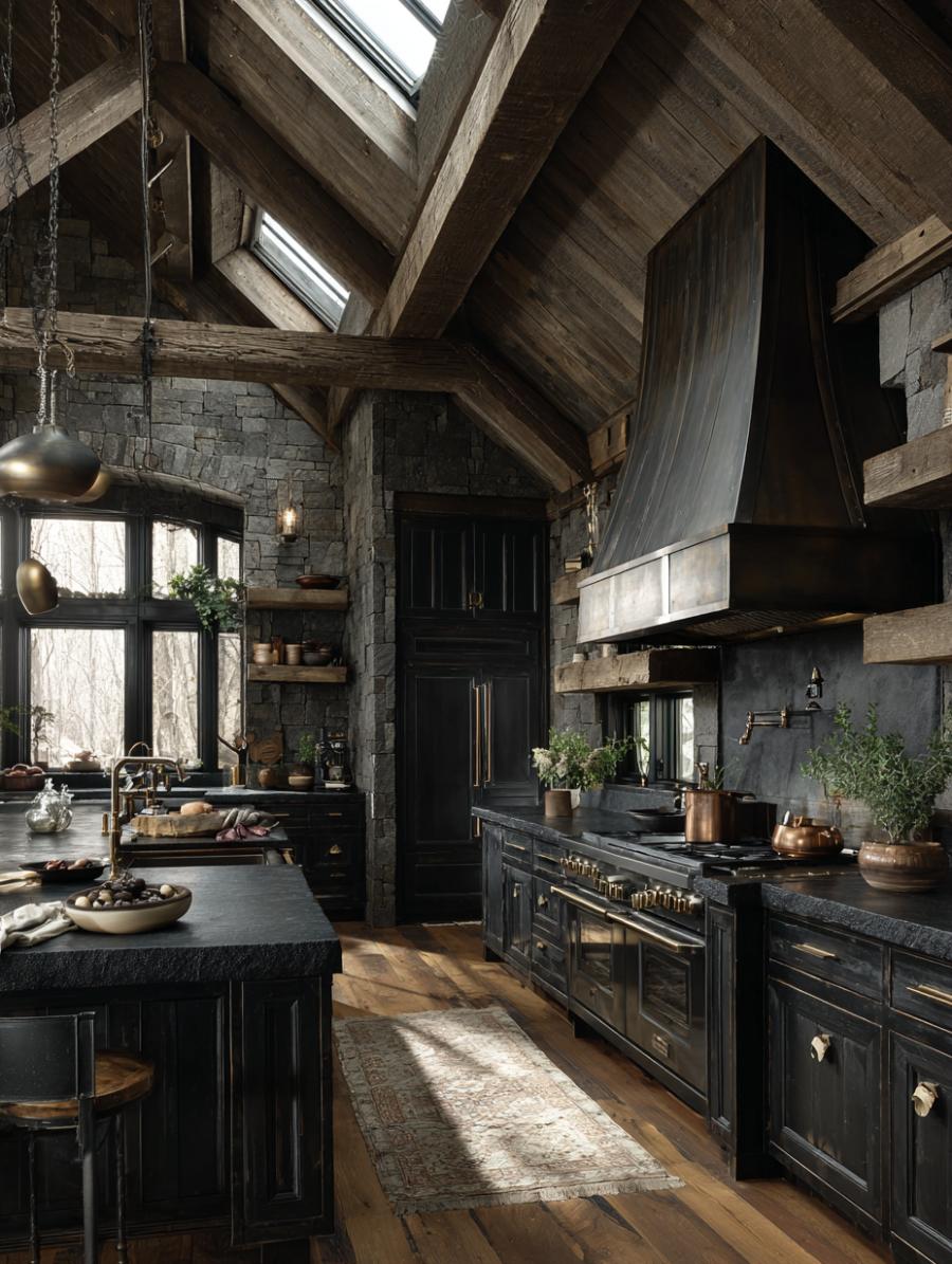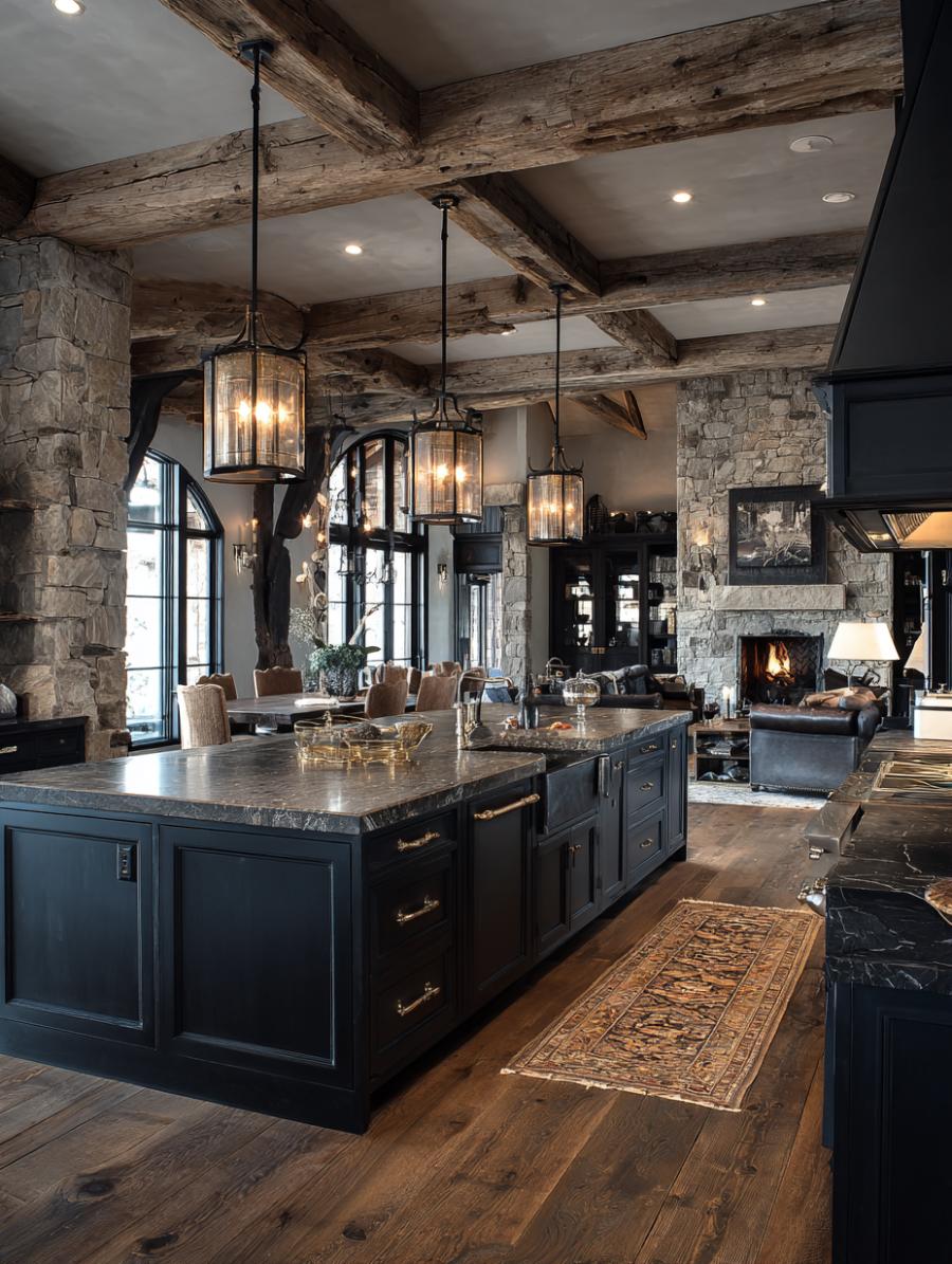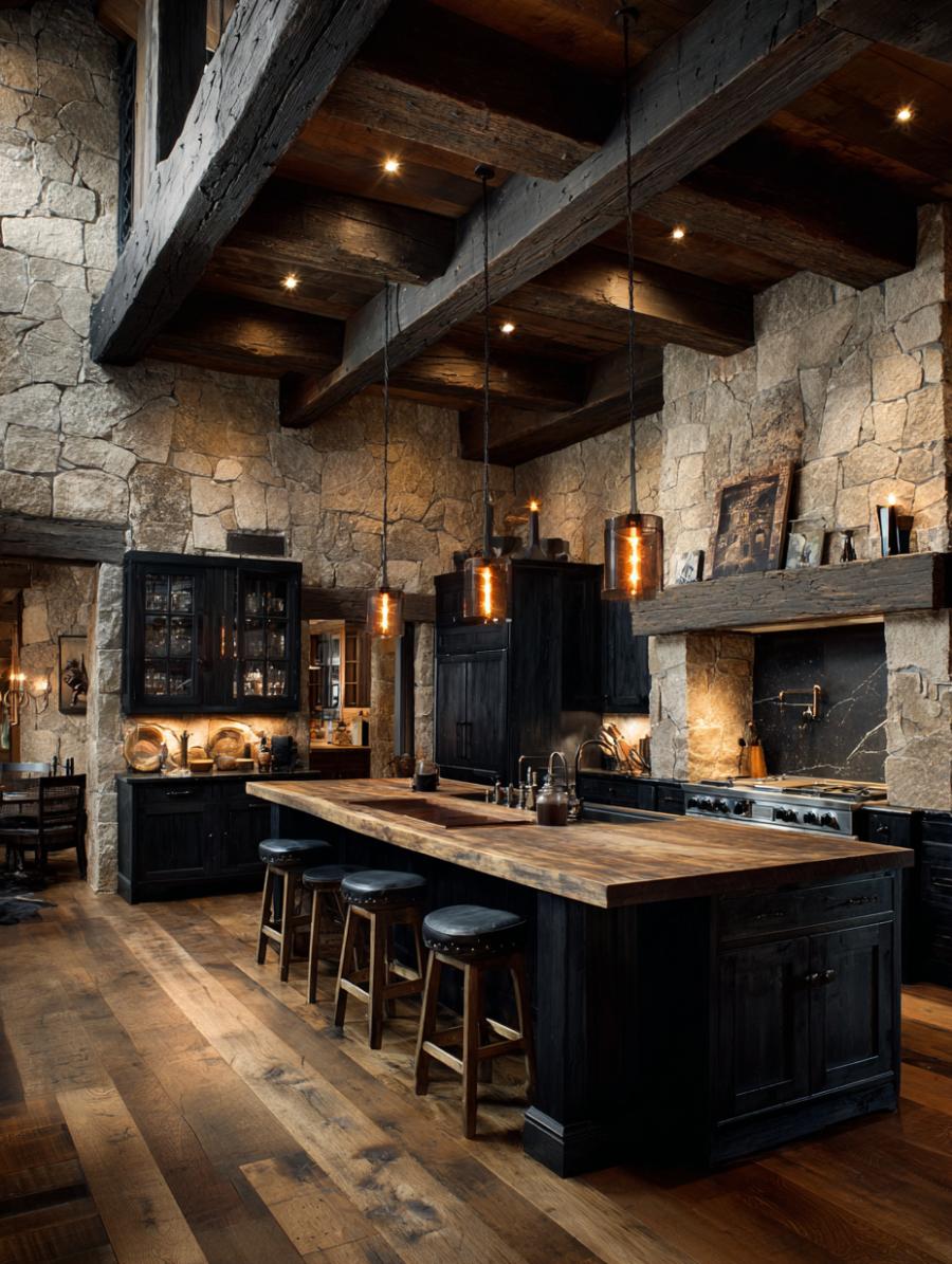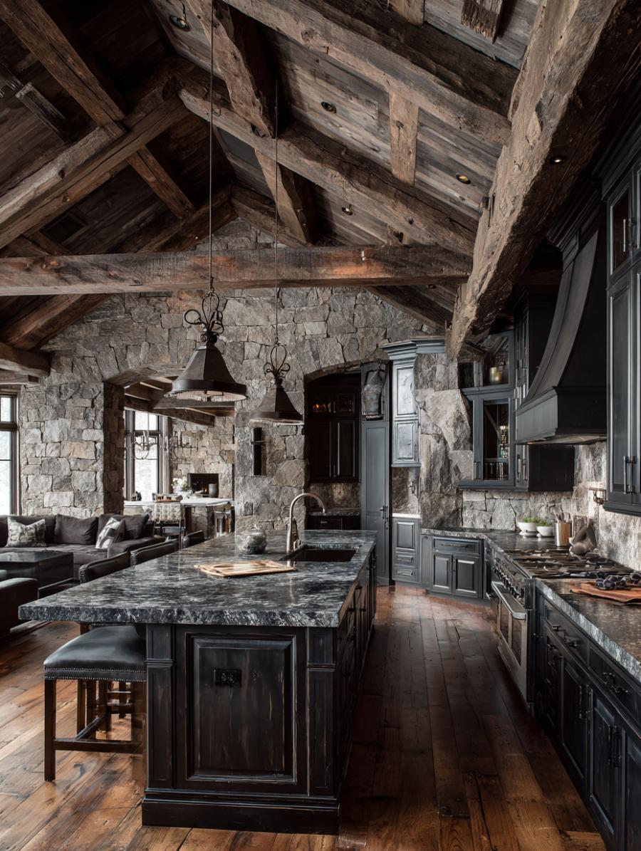 This bold rustic kitchen is defined by its dramatic blackened beams, rugged stone textures, and deep earthy tones. The contrast between dark structural elements and warm lighting creates a moody, high-impact atmosphere. It’s a space built for homeowners who want rustic character with unapologetic presence.