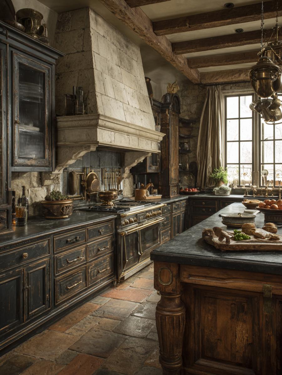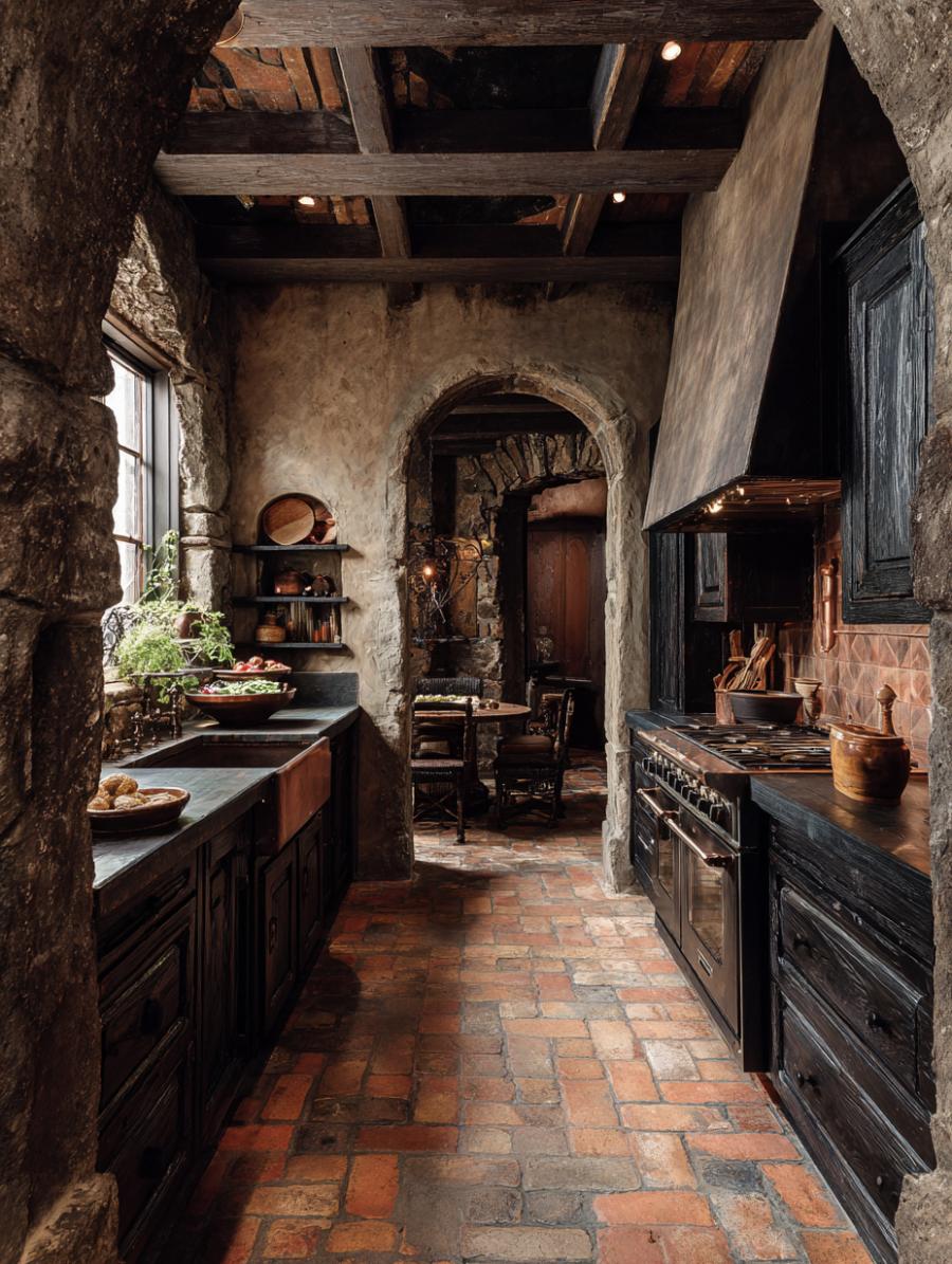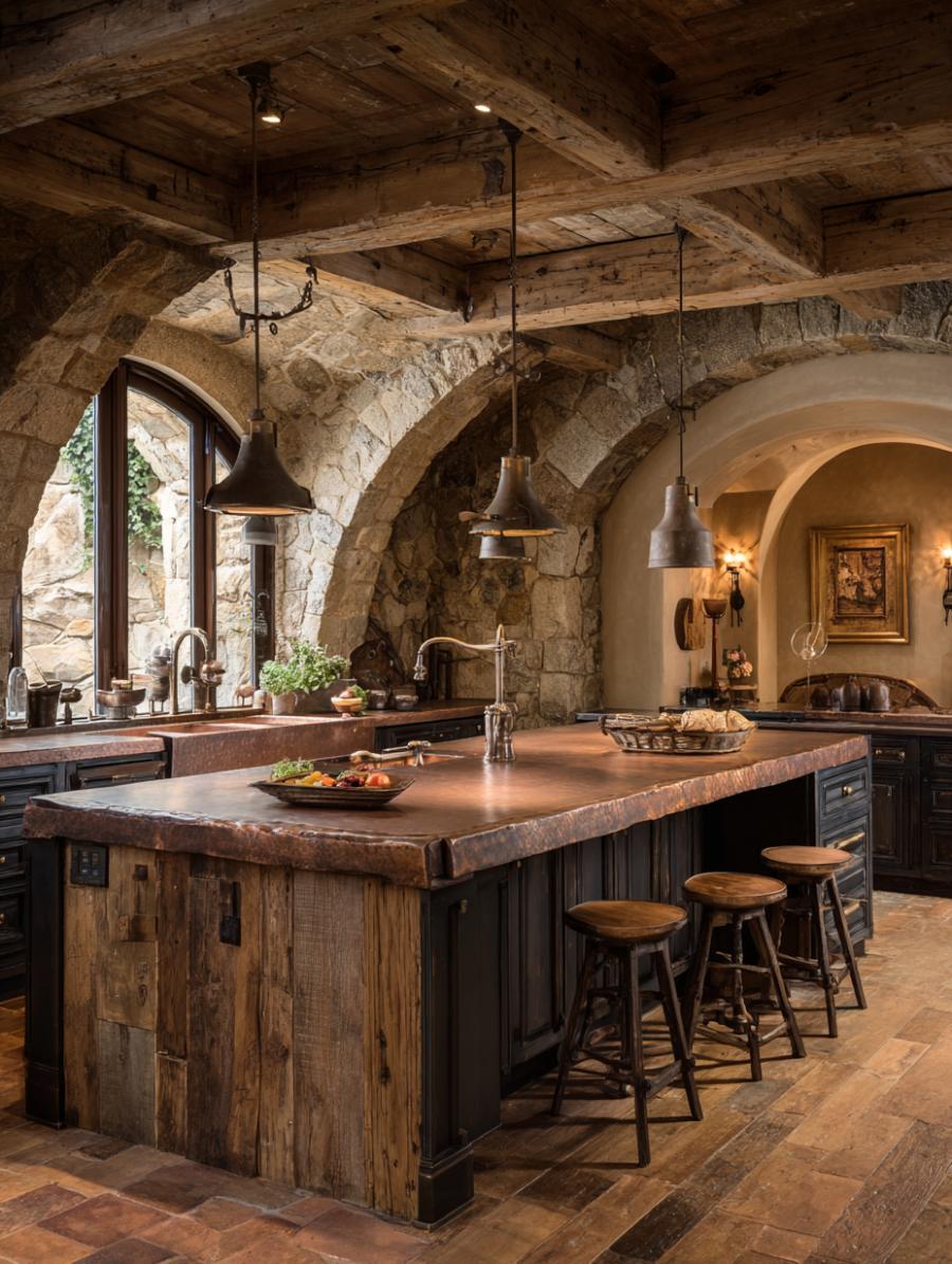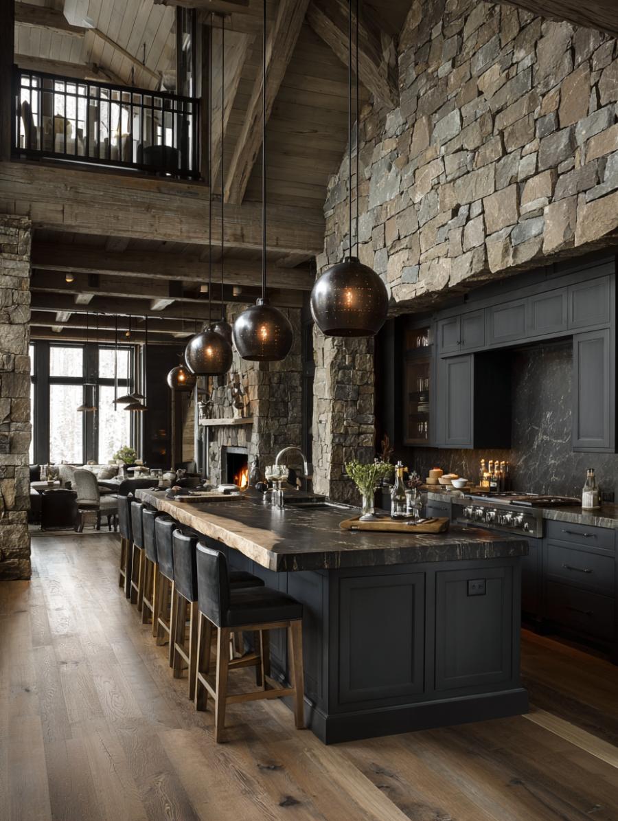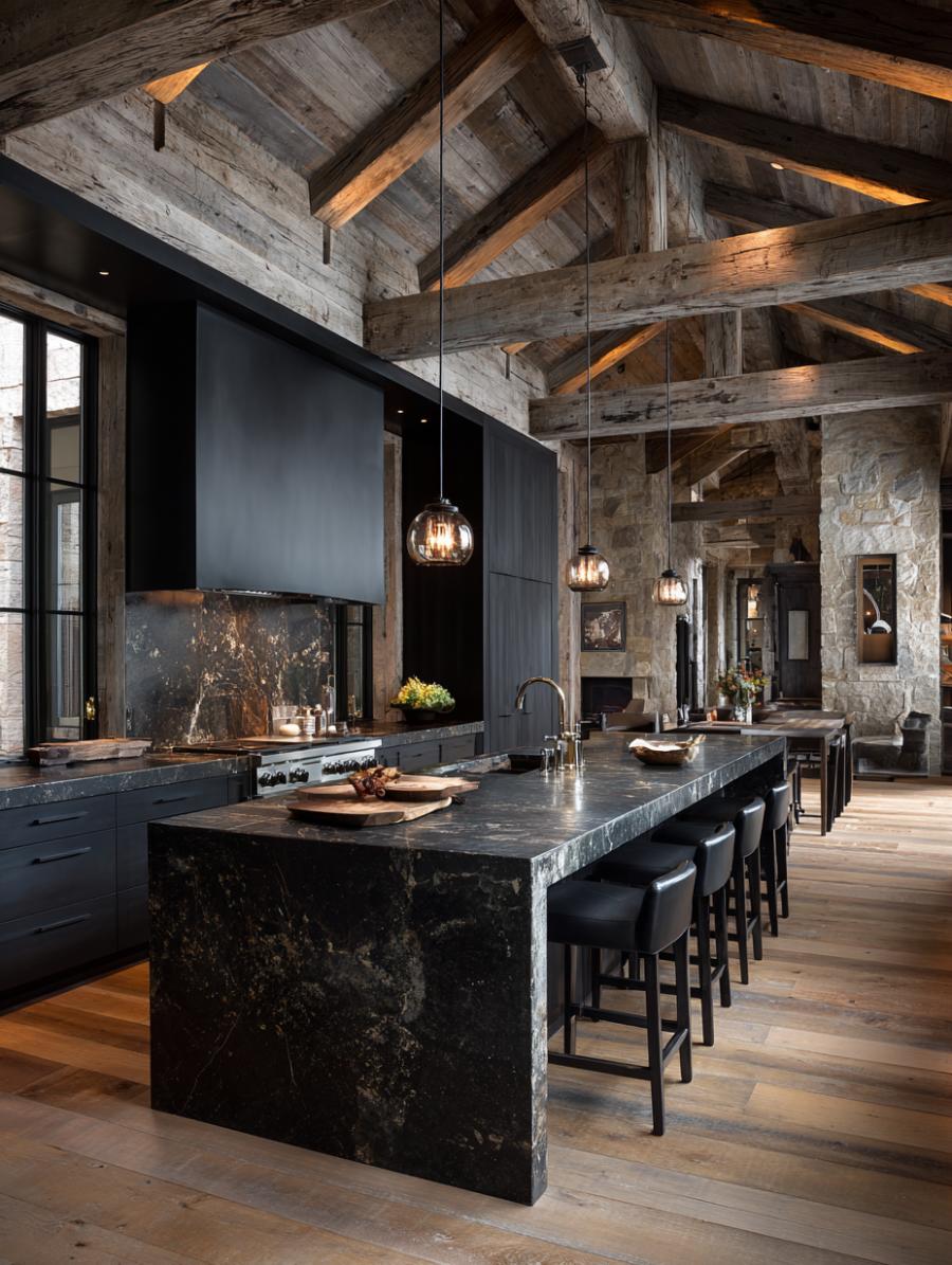 This bold rustic kitchen is defined by its dramatic blackened beams, rugged stone textures, and deep earthy tones. The contrast between dark structural elements and warm lighting creates a moody, high-impact atmosphere. It’s a space built for homeowners who want rustic character with unapologetic presence.