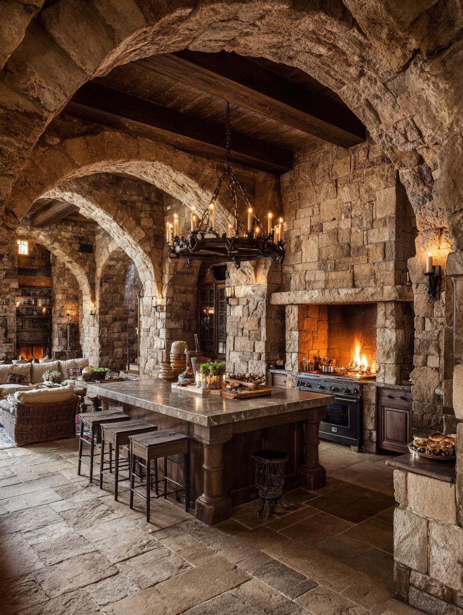 Rough stone walls create a naturally dramatic backdrop in this rustic kitchen, complemented by traditional timberwork and warm earthy finishes. Metal accents and soft lighting elevate the rugged textures, resulting in a space that feels both grounded and luxuriously handcrafted.