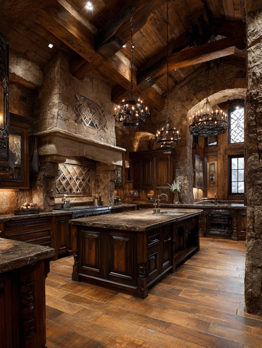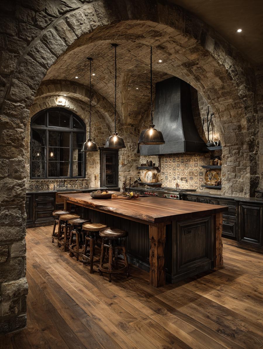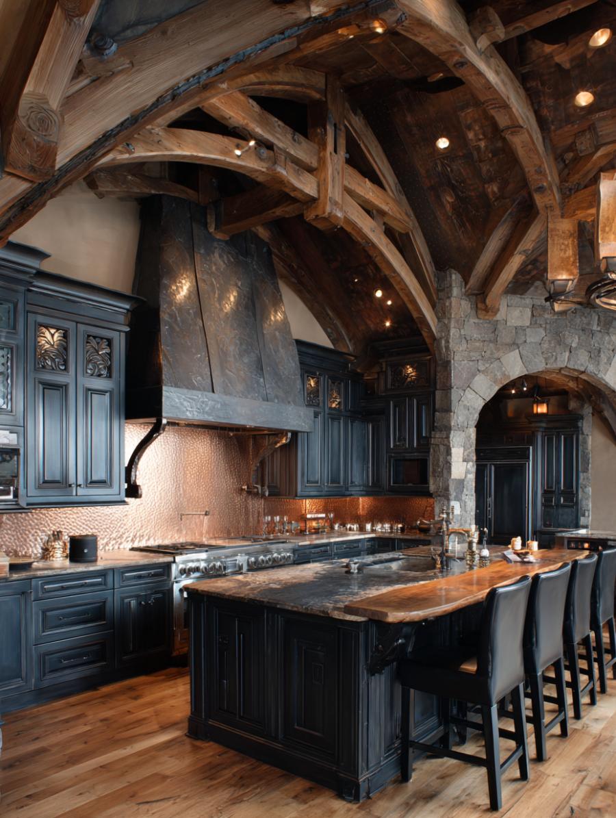 This gourmet rustic kitchen blends heavyweight materials with professional-grade appliances, creating a space that is both visually striking and performance-focused. Dark wood cabinetry, textured stone, and bold metal accents evoke a sense of old-world culinary mastery. It’s a dramatic, hardworking kitchen built for serious cooking and stylish living.